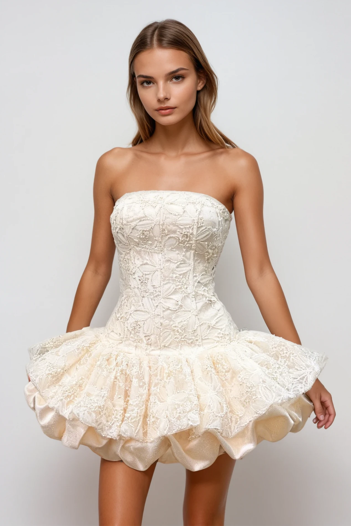 Donagh Strapless Floral Bubble Mini Dress In Beige This strapless mini dress combines romantic florals with contemporary silhouette design. The structured bubble hem creates dimensional movement while the beige palette offers versatile styling options for day or evening occasions. The strapless neckline provides an elegant, unobstructed view of the shoulders and décolletage. Crafted with attention to fit and proportion, this piece transitions seamlessly from casual outings to more refined events. The floral print adds visual interest without overwhelming the refined beige base, making it a sophisticated choice for those seeking understated elegance with modern construction.
