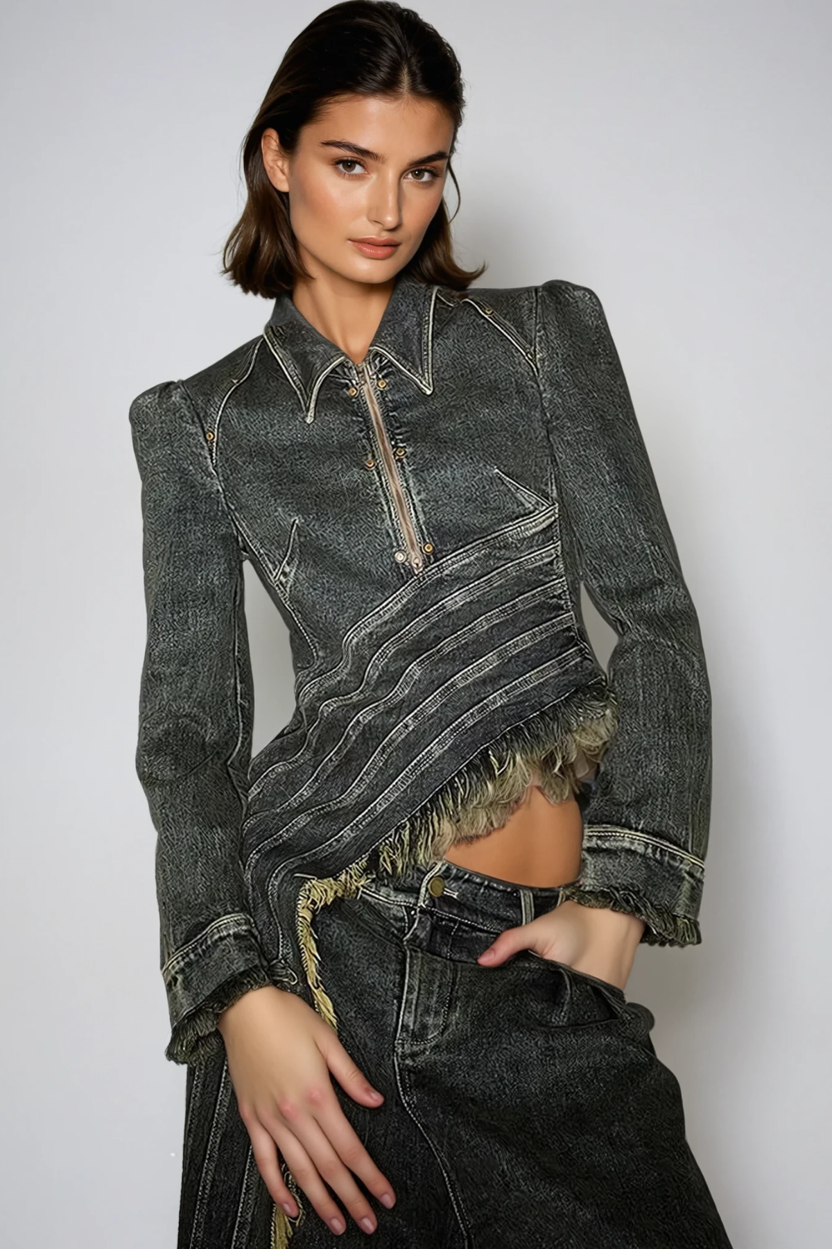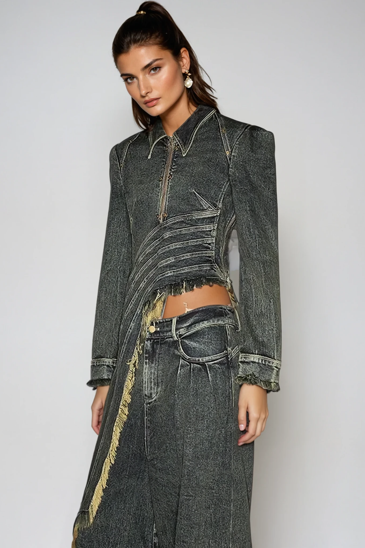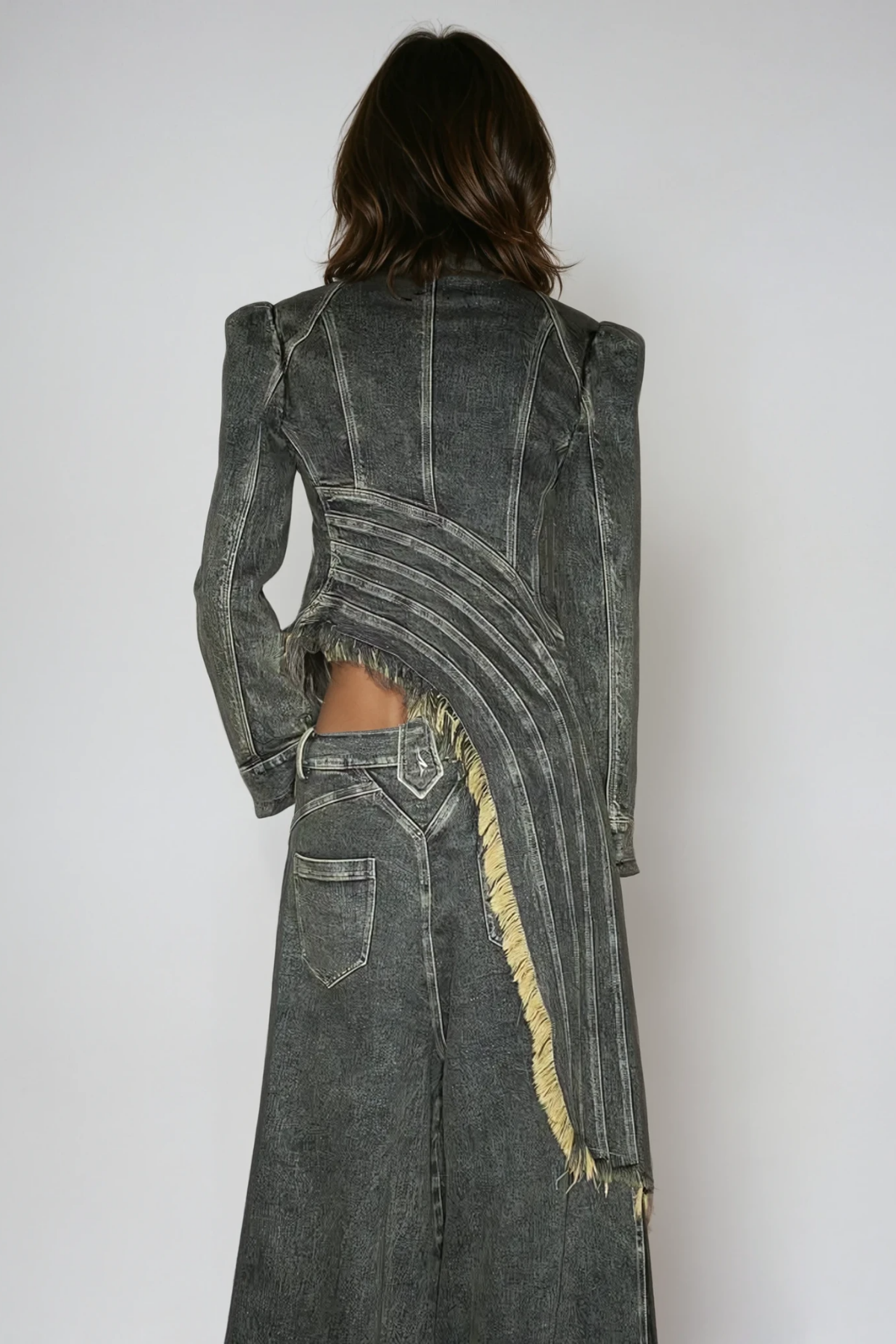 Donggeun's asymmetric deconstruct denim top exemplifies contemporary design through strategic fabric manipulation and unconventional silhouetting. The deconstructed elements—raw seams, selective distressing, and irregular hemlines—create visual interest while maintaining the structural integrity of premium denim. The asymmetrical cut offers a modern alternative to traditional tops, allowing for versatile styling across casual and elevated wardrobes. This piece demonstrates technical craftsmanship in its intentional construction, where each element serves both aesthetic and functional purposes. Ideal for those seeking distinctive pieces that challenge conventional fashion norms.