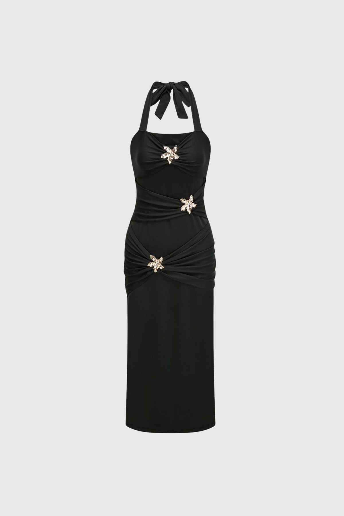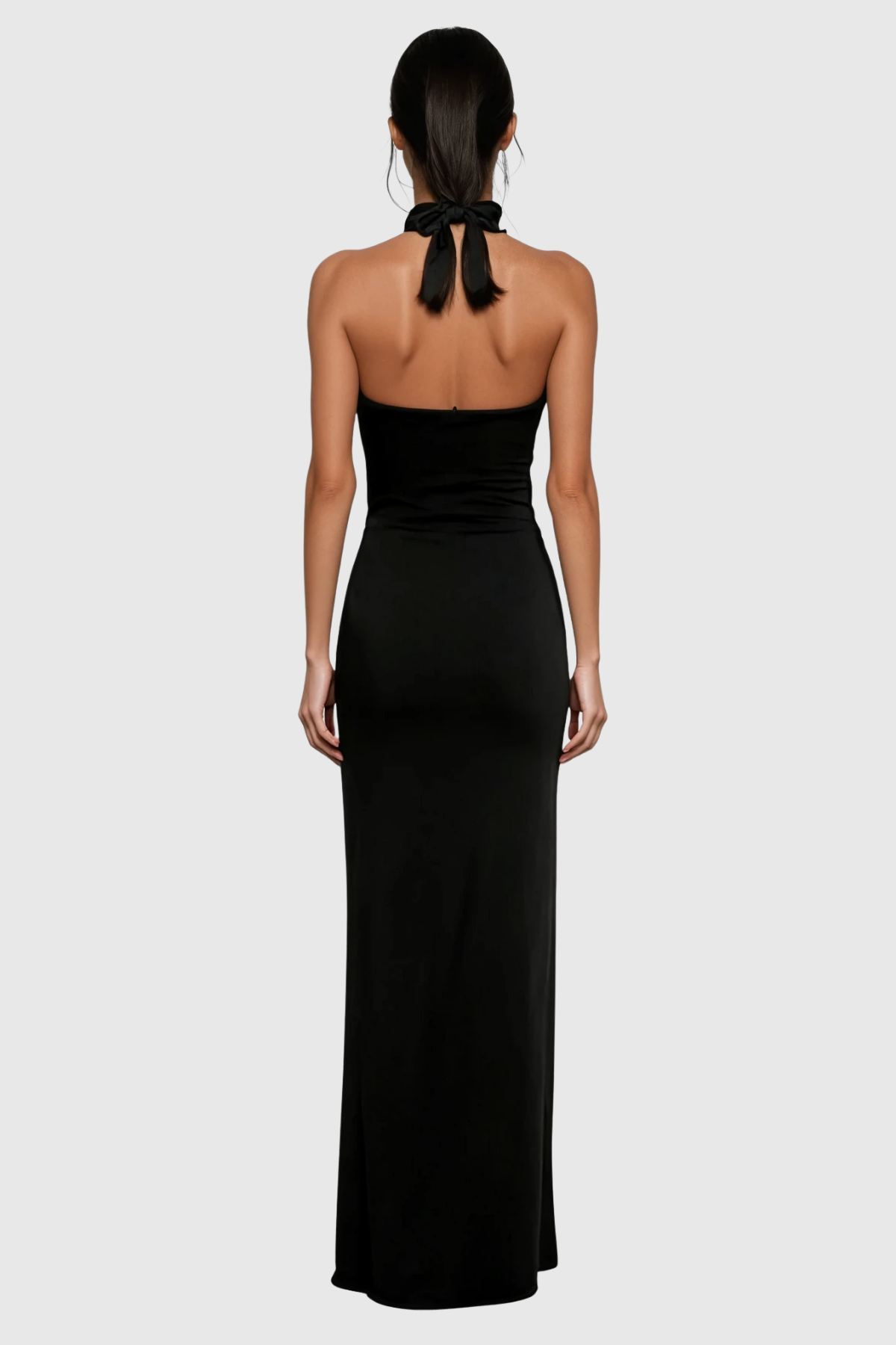 The Dor Halter Neck Embellished Maxi Dress in Black combines timeless elegance with contemporary sophistication. This floor-length silhouette features a flattering halter neckline that frames the shoulders while the intricate embellishments add refined visual interest throughout. The flowing maxi cut provides graceful movement and versatile styling options, transitioning seamlessly from evening events to upscale occasions. Crafted with attention to detail, this black dress serves as a polished foundation piece for any refined wardrobe, offering both comfort and undeniable presence.