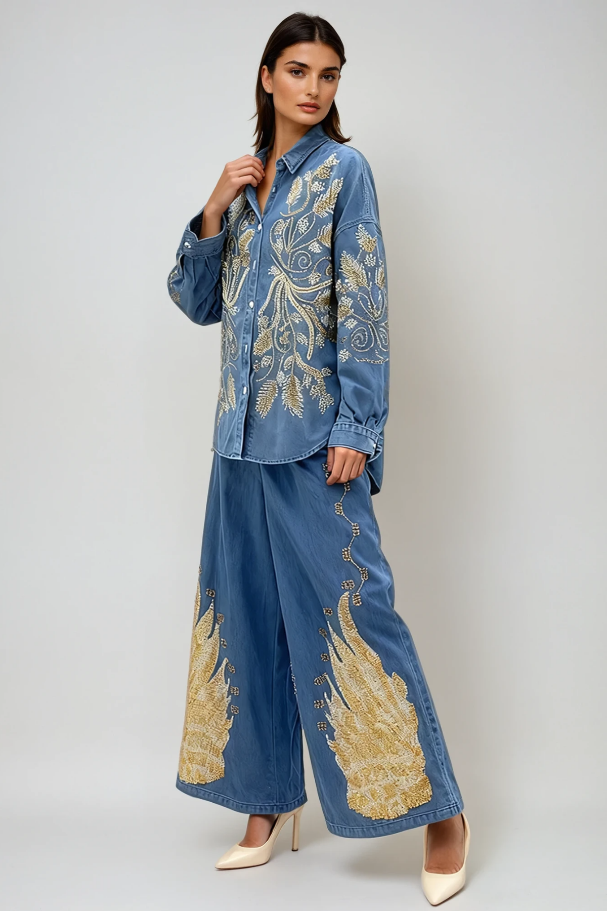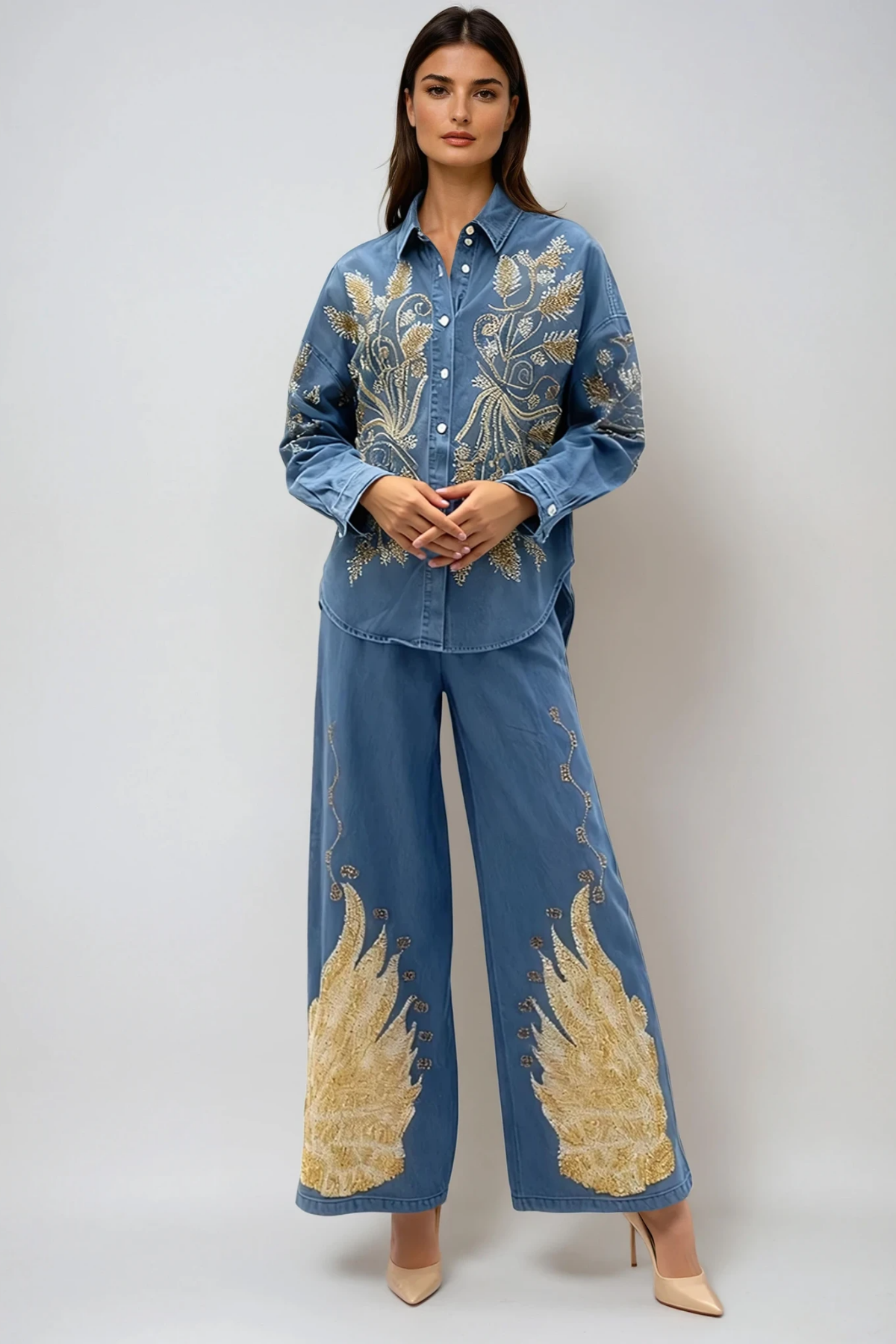Dowlet Long Sleeve Embroidered Denim Pants Set