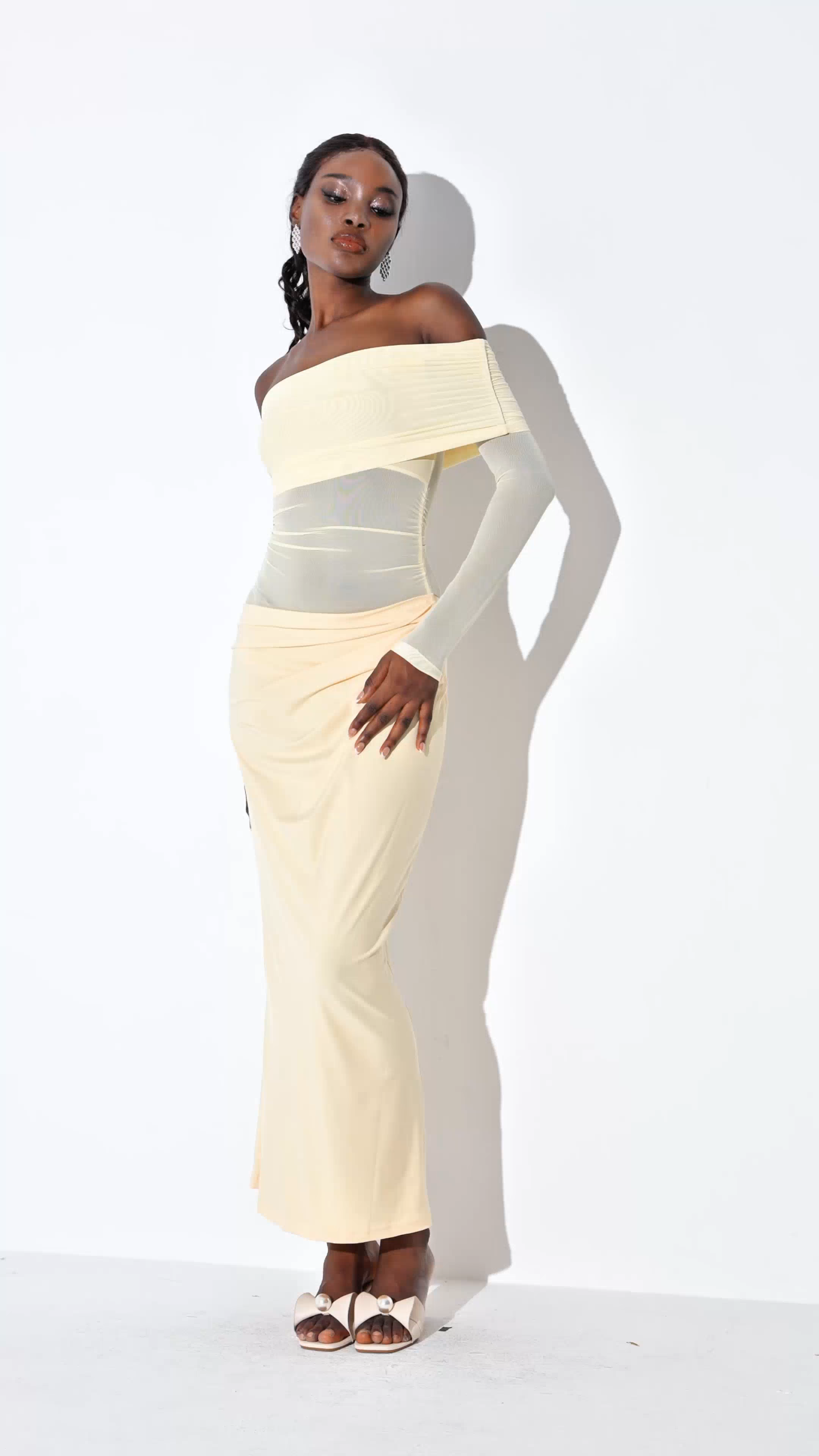 The Earline Off Shoulder Ruched Mesh Maxi Dress in Yellow combines elegant design with a flattering fit. Crafted from lightweight mesh, it features an off-shoulder neckline and ruched detailing that enhances silhouette definition. Its maxi length offers graceful movement, making it perfect for formal occasions or stylish events. The vibrant yellow hue adds a fresh, radiant touch to your wardrobe, ensuring you stand out with understated sophistication.