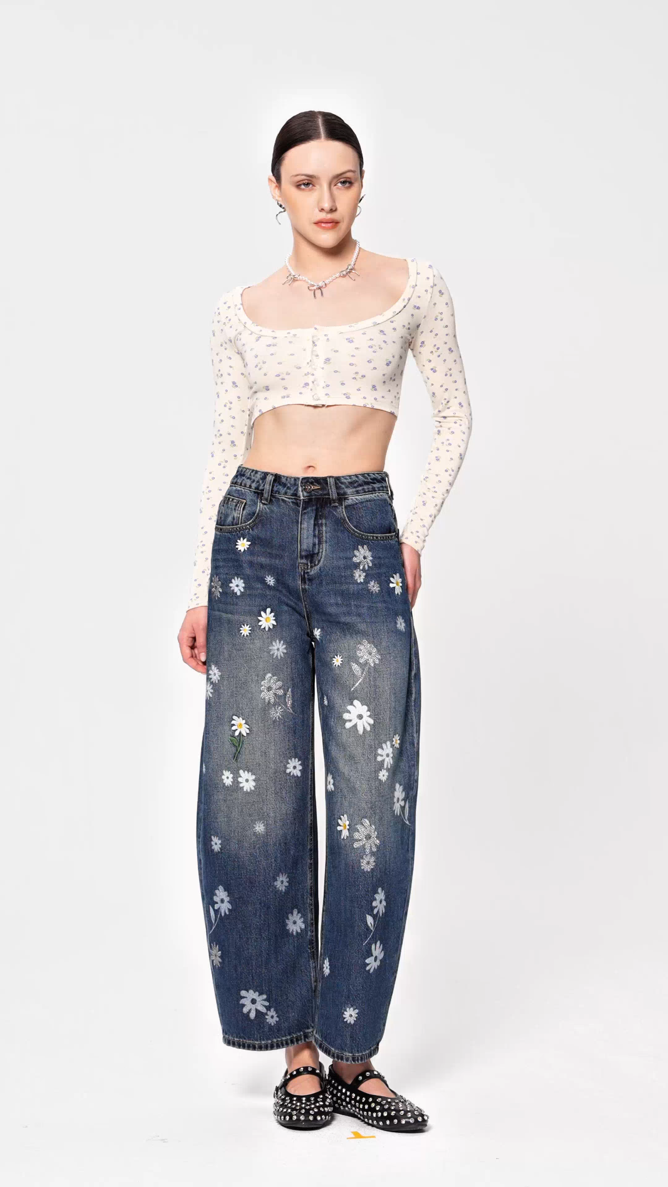 Eir Floral Barrel Jeans combine contemporary silhouette with botanical artistry. The barrel leg cut delivers a modern, relaxed fit that tapers subtly at the ankle, while the floral detailing adds visual interest and personality. Crafted with premium denim construction, these jeans offer durability and comfort for everyday wear. The versatile design transitions seamlessly from casual to elevated styling, making them a distinctive addition to any wardrobe. Perfect for those seeking distinctive denim that balances trend-forward aesthetics with timeless quality.