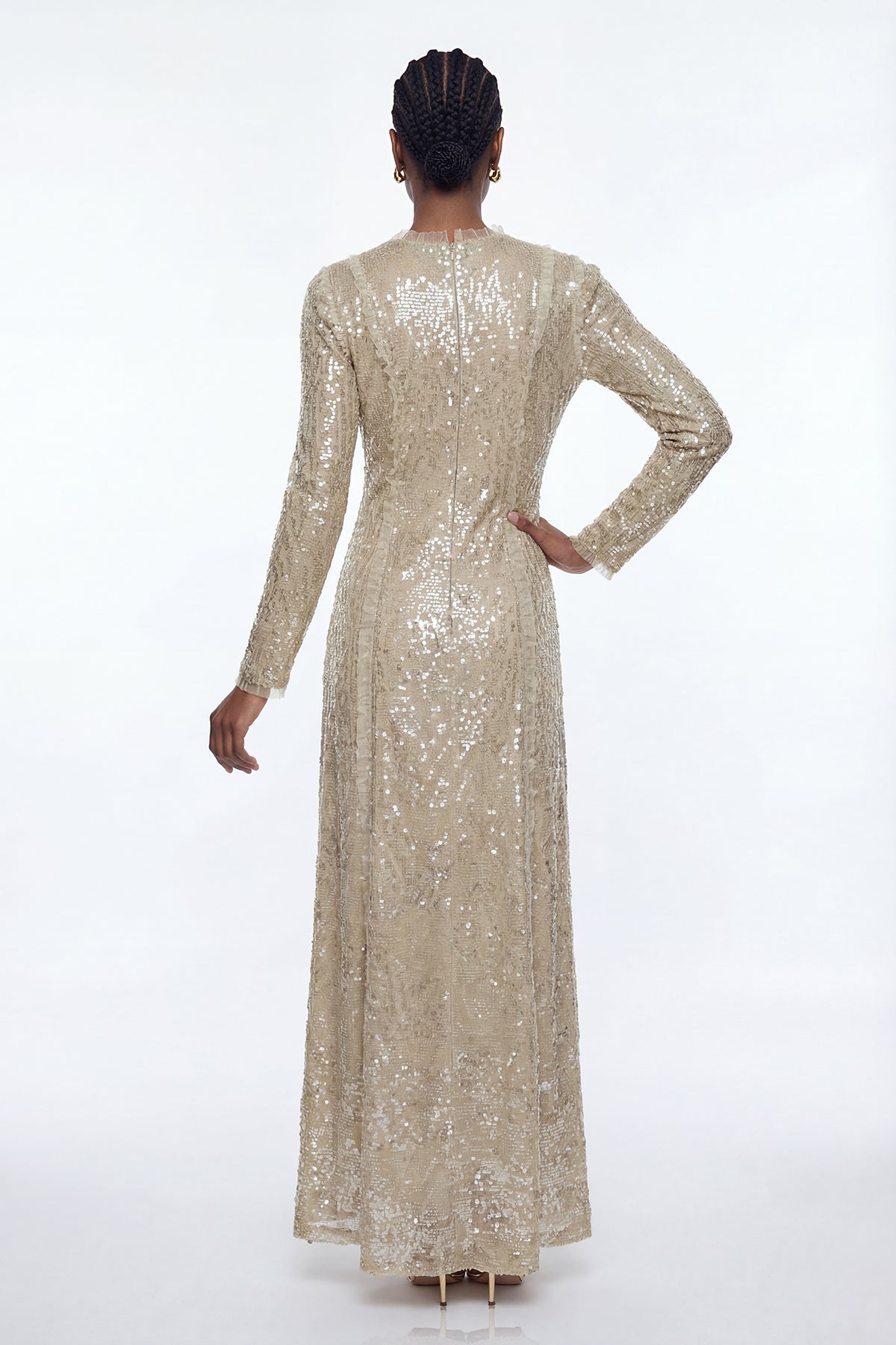 The Eliud Sequin Mesh Maxi Dress combines sophisticated elegance with contemporary design. Crafted from delicate mesh fabric adorned with shimmering sequins, this floor-length silhouette delivers refined glamour for evening occasions. The flowing maxi cut provides graceful movement and flattering proportions, while the sequin detailing catches light beautifully throughout the night. Perfect for galas, formal events, or upscale celebrations, this dress makes a striking statement piece that transitions seamlessly from cocktail hour to dancing.