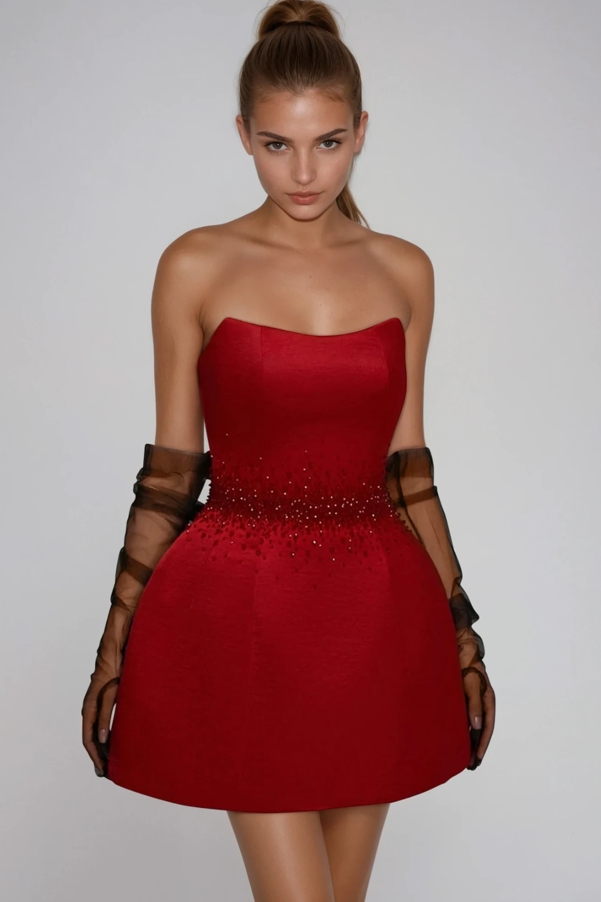 The Fakhriyya Strapless Rhinestone Mini Dress combines sophisticated elegance with contemporary flair. This striking piece features a strapless silhouette that showcases the shoulders and neckline, while intricate rhinestone embellishments add luxurious sparkle and dimension. The mini length creates a modern, flattering profile ideal for evening events, cocktail parties, or special occasions. Crafted for a polished appearance, this dress delivers high-impact style with refined detailing that commands attention.