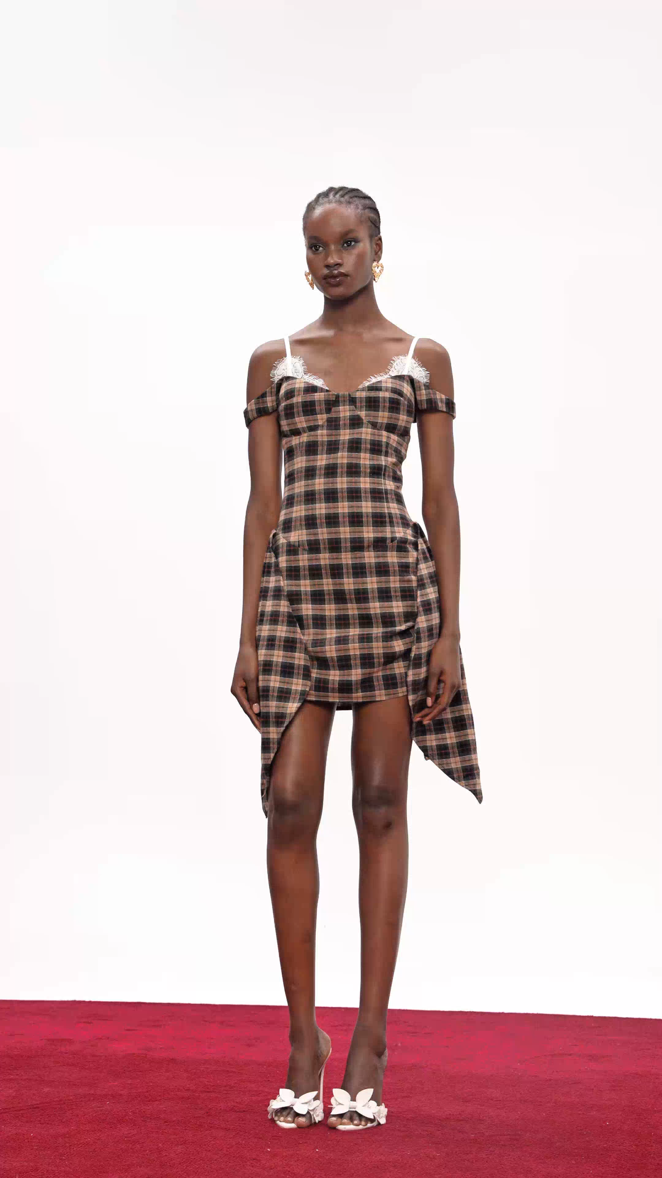 Ceyhun Grid Fringe Spaghetti Mini Dress In Brown