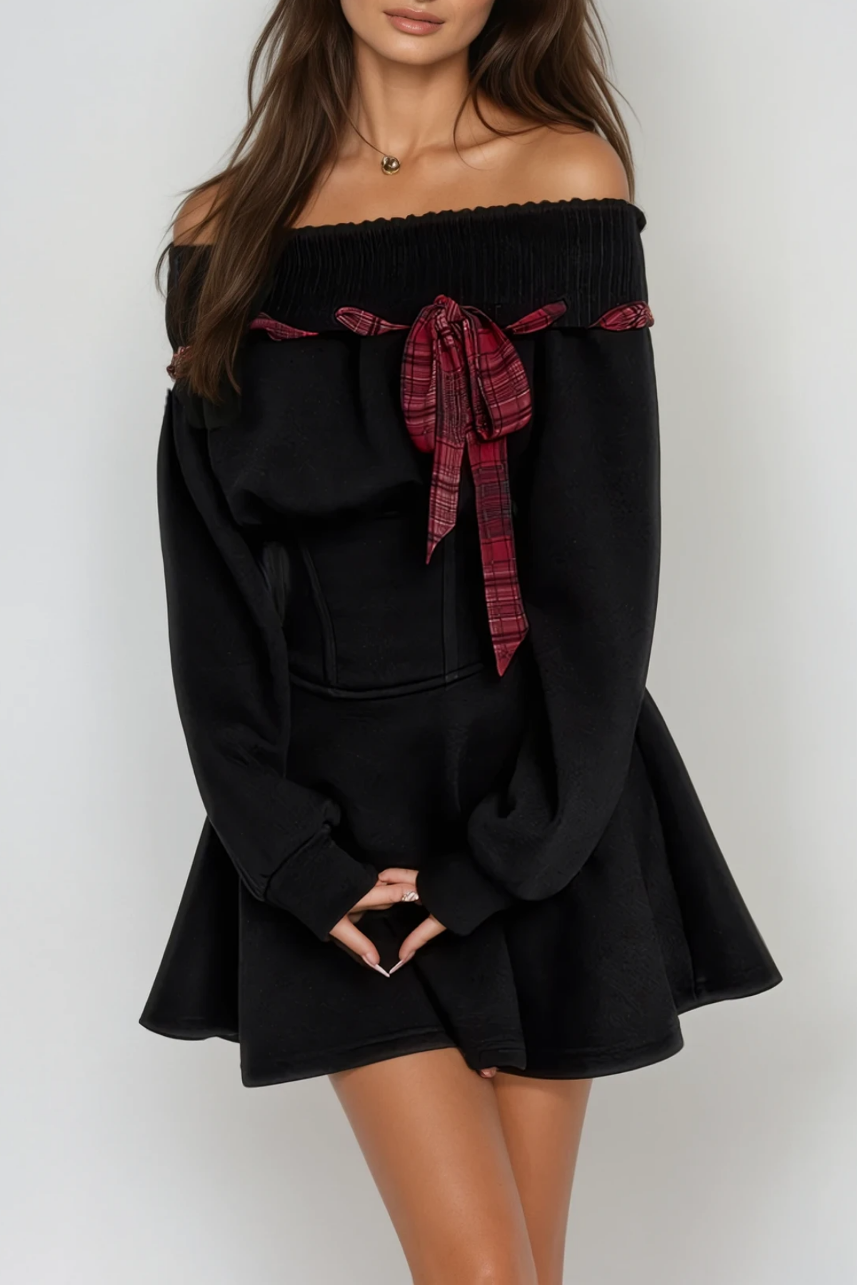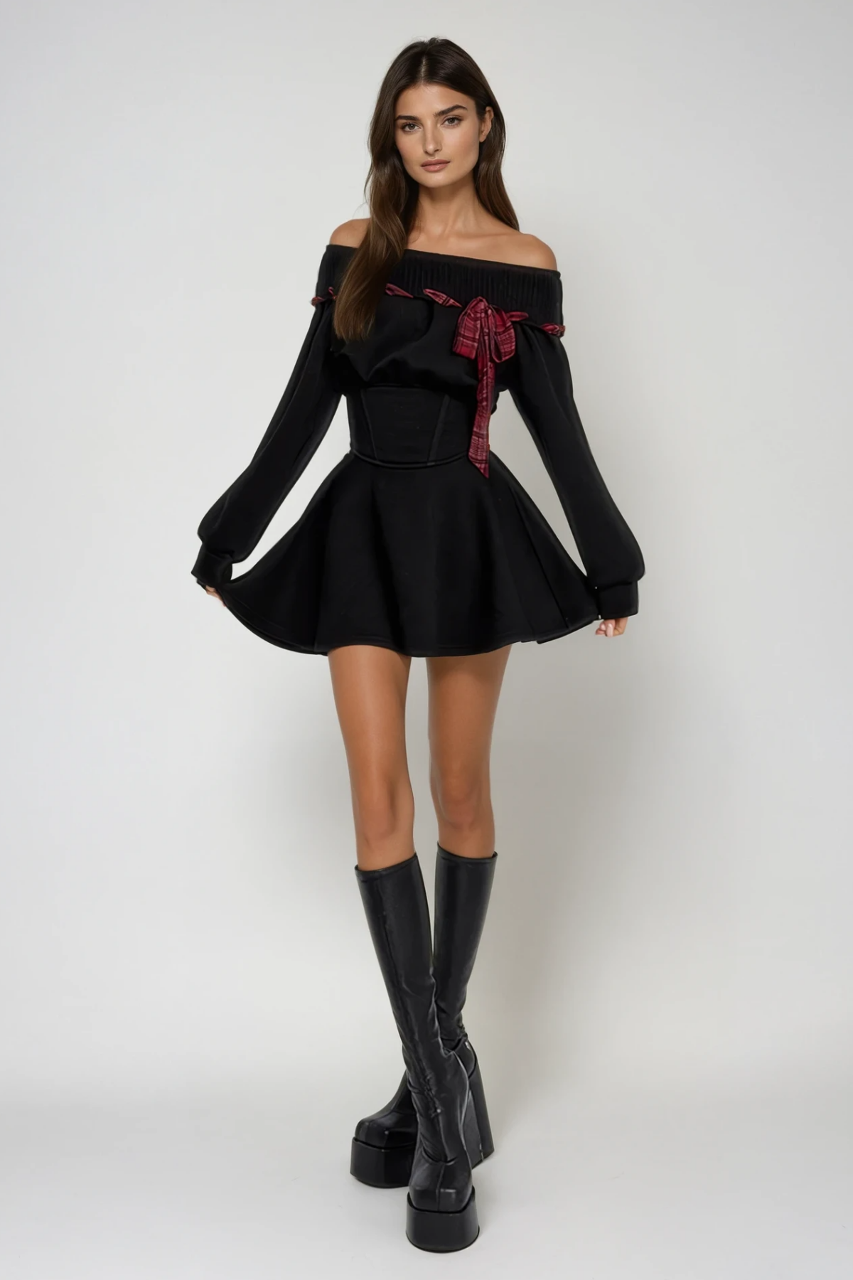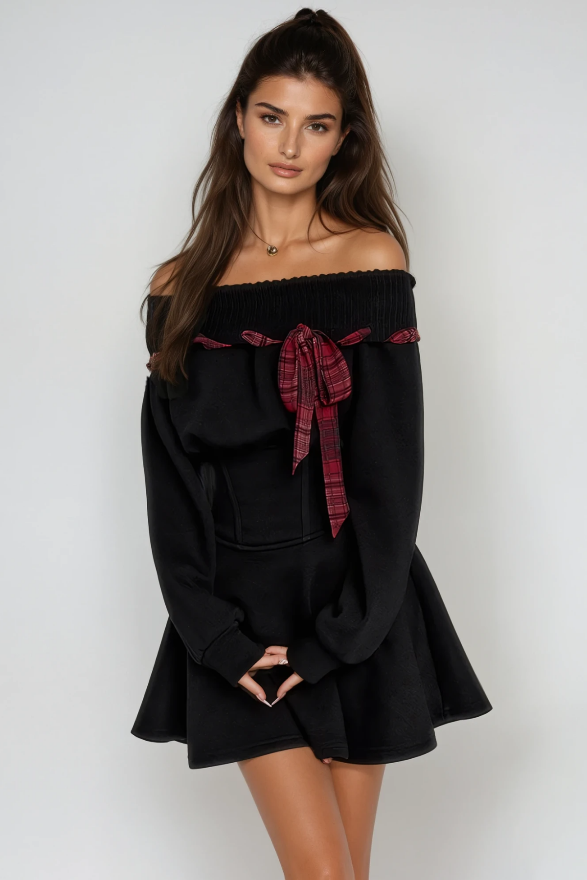 Derrick Off Shoulder Asymmetric Mini Dress In Black This striking mini dress combines contemporary design with timeless sophistication. The off-shoulder neckline creates an elegant, modern silhouette while the asymmetric hemline adds an unexpected edge that elevates your evening look. Crafted in classic black, this piece transitions seamlessly from cocktail events to upscale casual occasions. The strategic cut flatters the shoulders and collarbone, making it an ideal choice for those seeking a dress that balances boldness with refined elegance. Perfect for making a statement without compromising on wearability.