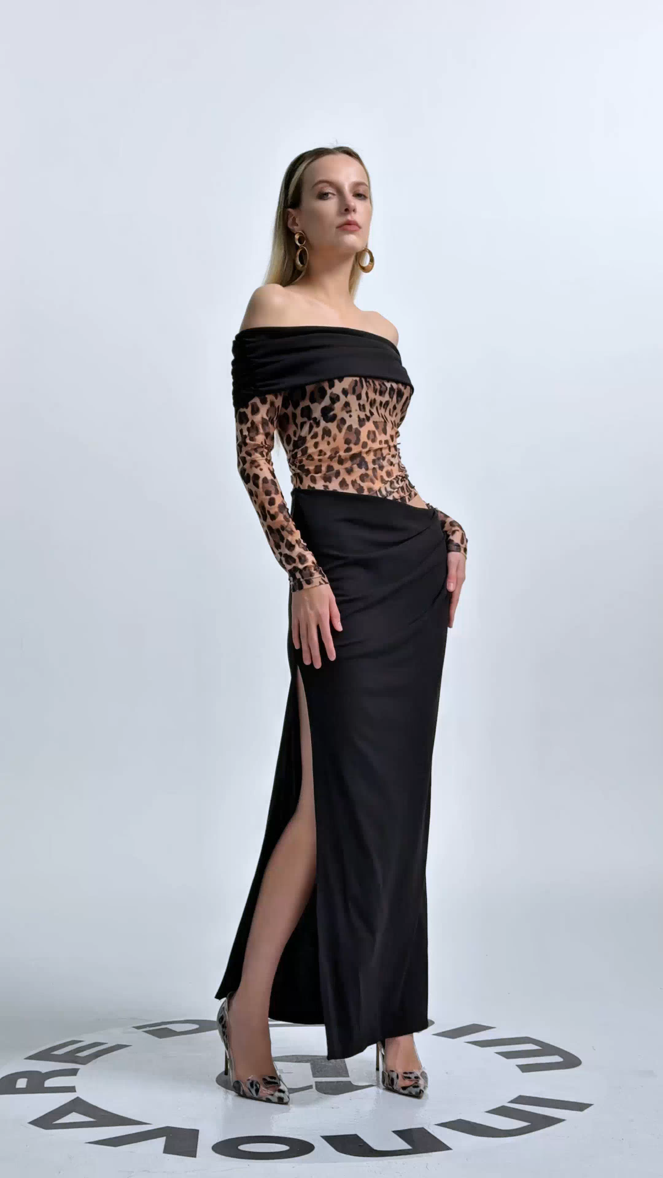 Amunet Off Shoulder Leopard Split Maxi Dress