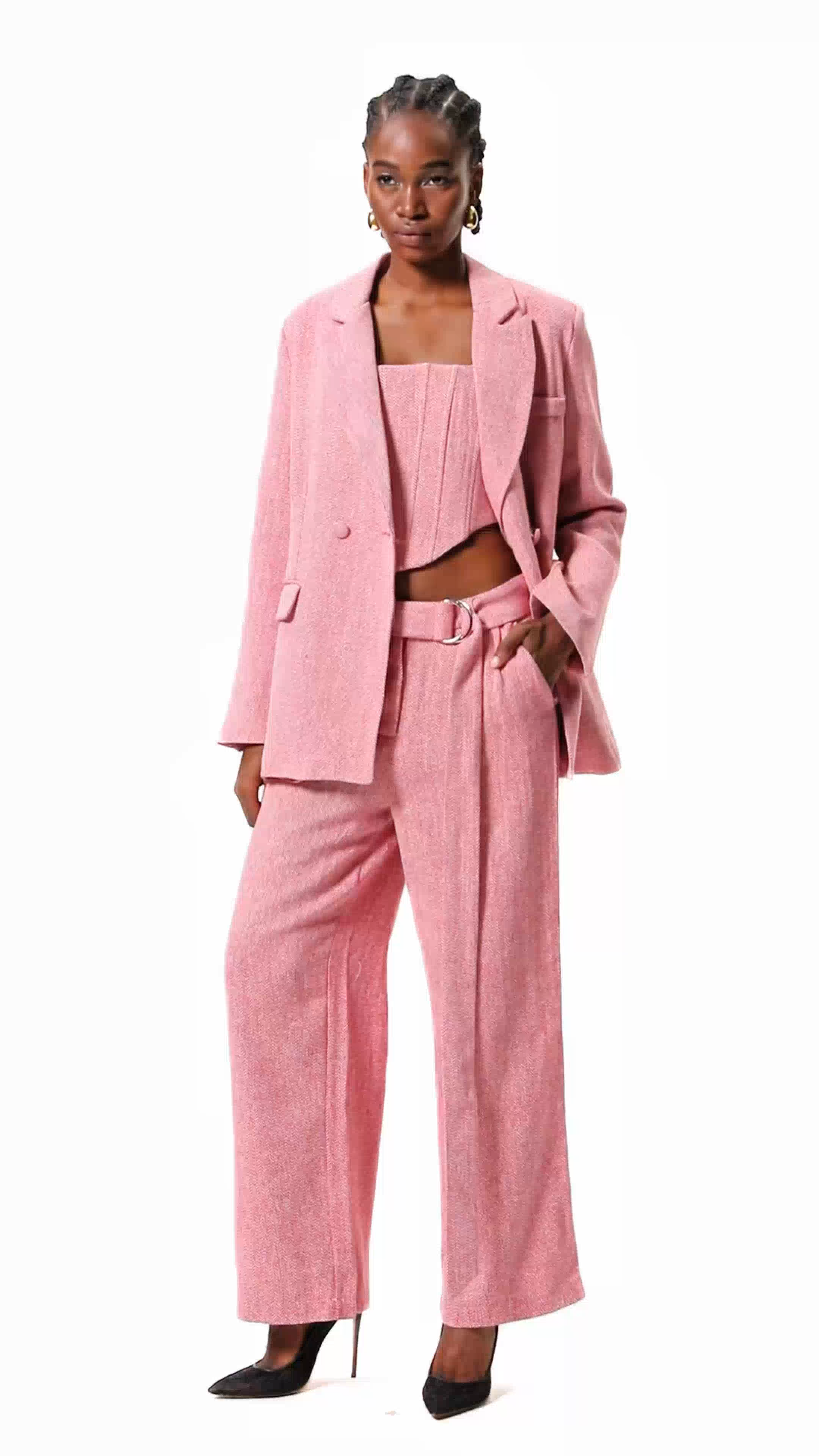 Expertly crafted for style and comfort, the Anang Lapel Strapless Three Piece Pants Set is a must-have for any fashion-forward individual. The elegant lapel design and strapless top create a sophisticated silhouette, while the versatile three-piece set allows for easy mix-and-match styling. Available in a stunning shade of pink, this set is the perfect addition to your wardrobe.