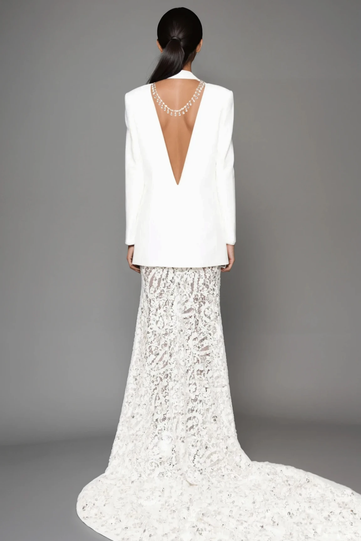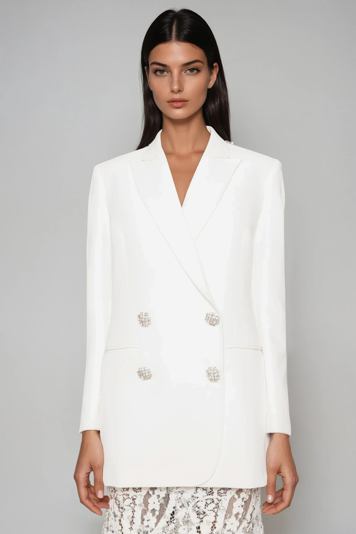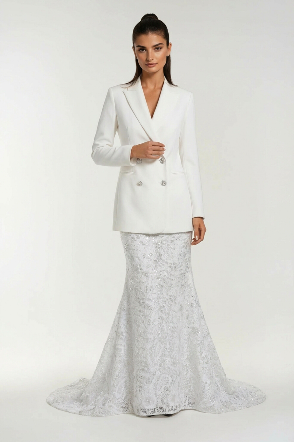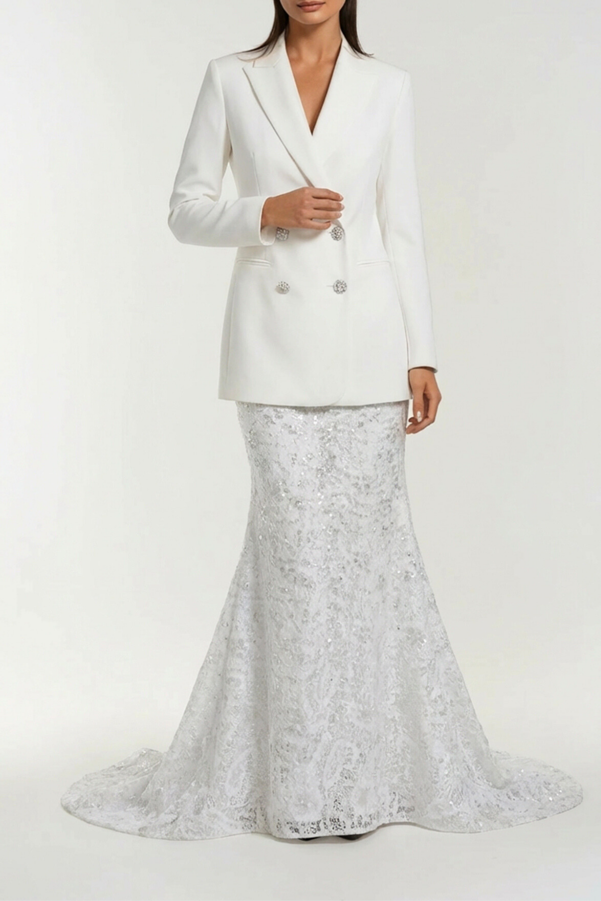 Elevate your evening wardrobe with this sophisticated Durai backless double breasted crystal skirt set. The structured double breasted top delivers polished tailoring, while the dramatic backless design creates an alluring silhouette. Delicate crystal embellishments catch the light with every movement, adding refined glamour to the coordinated skirt. Perfect for upscale events, galas, or occasions demanding statement-making elegance. This expertly crafted two-piece set combines contemporary design with timeless sophistication.
