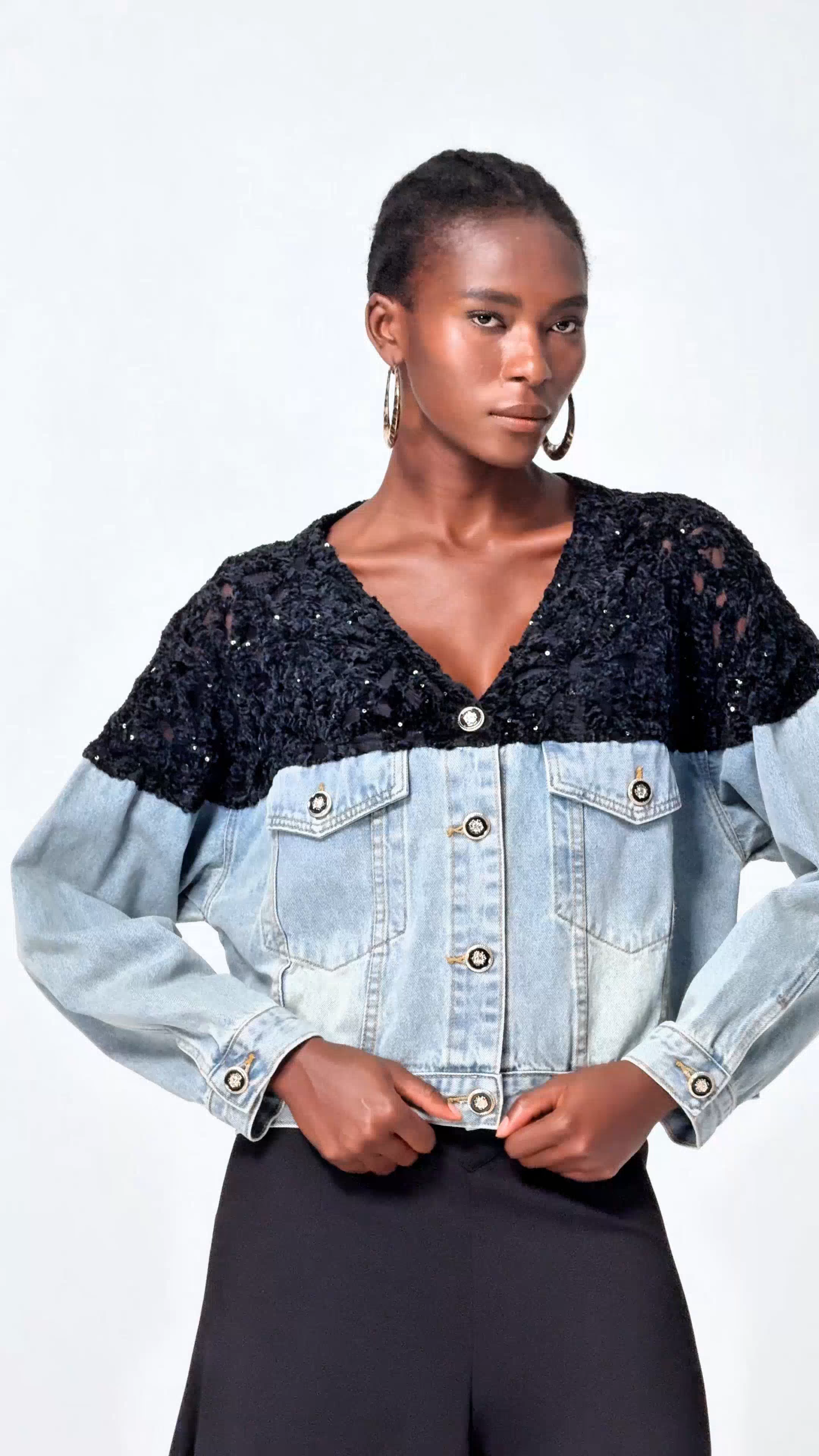 Introducing the Bakhtiyar Embroidered Sequin Denim Jacket, a stunning addition to your wardrobe. The intricate embroidery and sequin details add a touch of elegance to this chic denim jacket. With its versatile and stylish design, this jacket will elevate any outfit. Experience the perfect blend of fashion and comfort with this must-have piece.