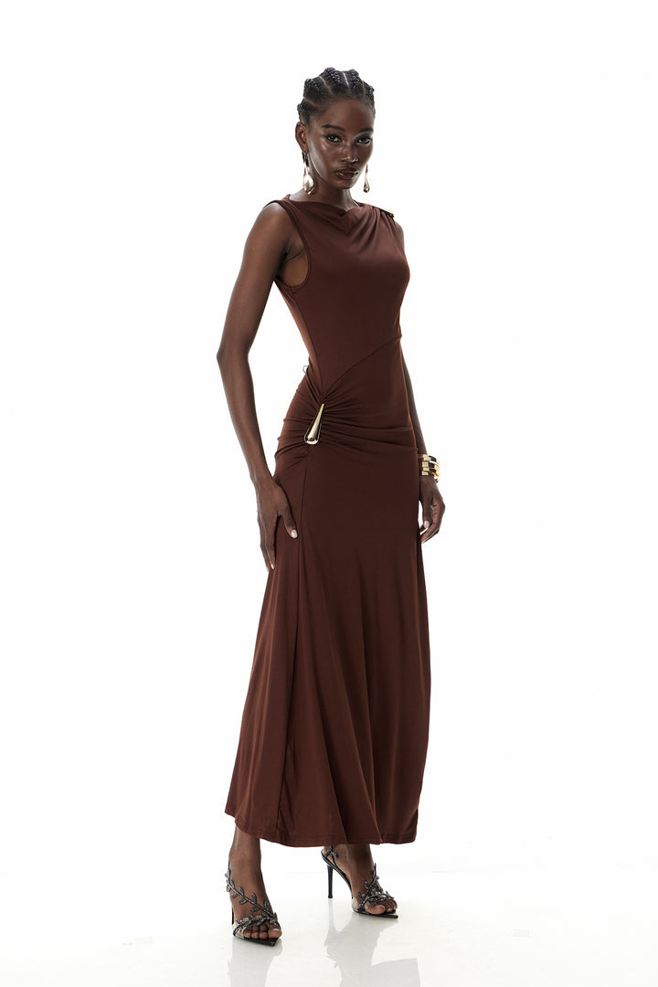 The Cristiano Sleeveless Ruch Maxi Dress features a sophisticated design with delicate ruching that enhances silhouette definition. Crafted for elegance and comfort, its sleeveless cut and flowing maxi length offer a versatile choice for formal occasions or stylish daytime events. This dress combines flattering fit with effortless grace, perfect for those seeking a refined yet contemporary look.