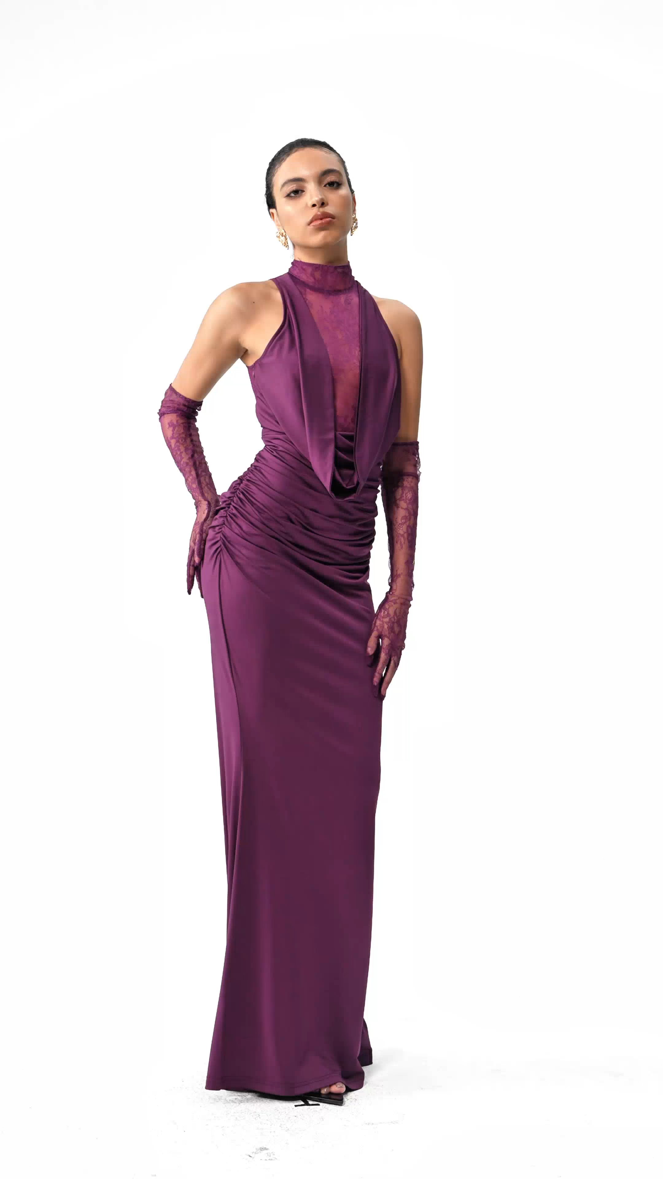 The Darleen Cowl Neck Ruch Lace Maxi Dress in Purple combines sophisticated elegance with refined craftsmanship. The graceful cowl neckline creates a flattering drape, while strategic ruching defines the silhouette for a polished, sculpted look. Delicate lace detailing adds texture and visual interest throughout, elevating the dress beyond everyday wear. The maxi length provides understated glamour suitable for evening events, formal occasions, or upscale gatherings. Rich purple tones enhance the luxurious aesthetic, offering a versatile alternative to traditional neutrals. This piece exemplifies contemporary design with timeless appeal, making it an essential addition to any refined wardrobe.