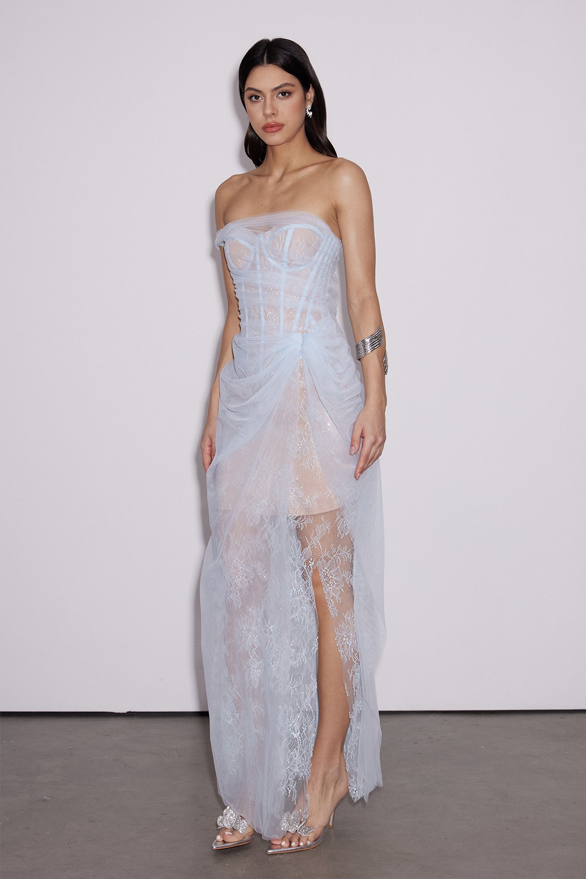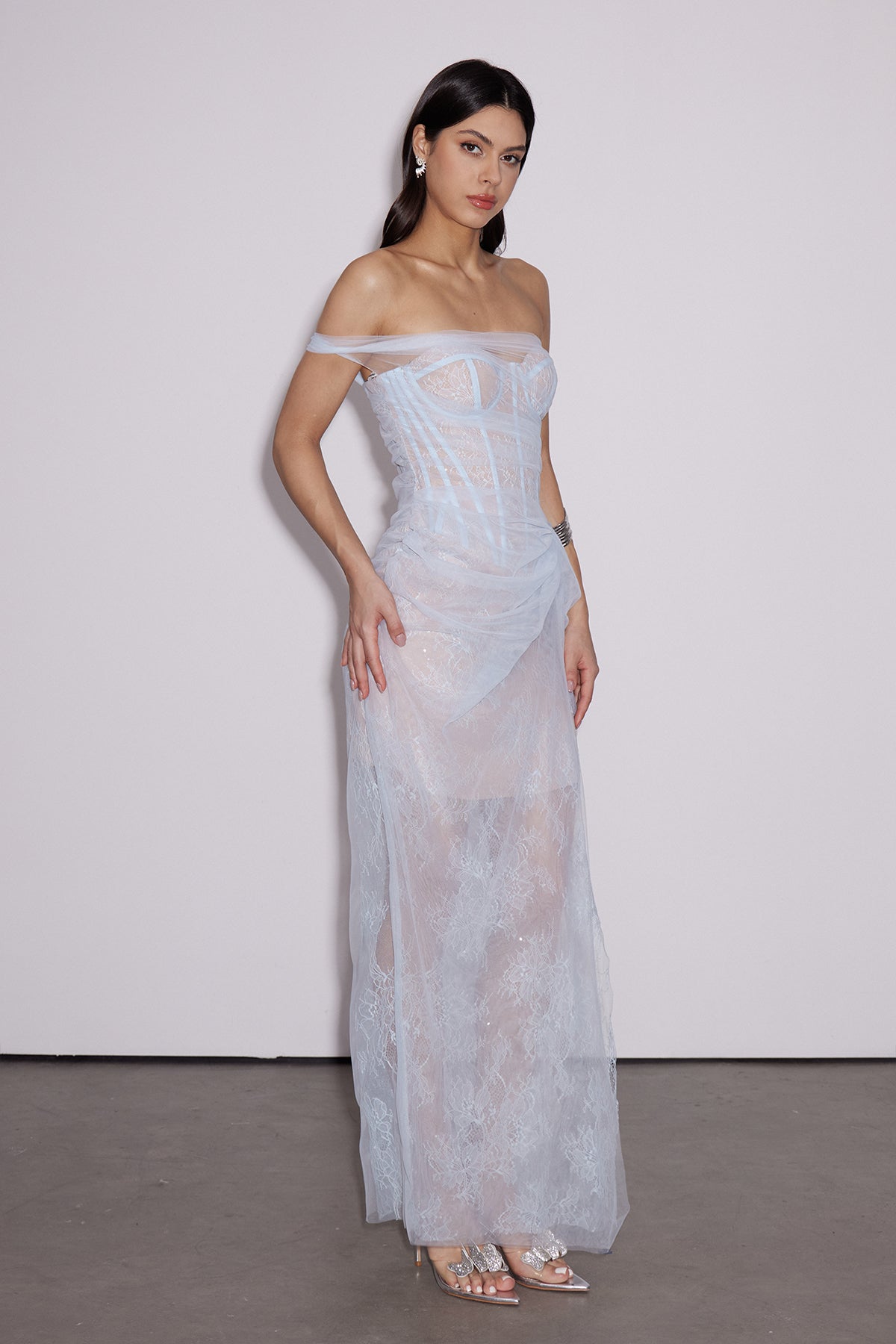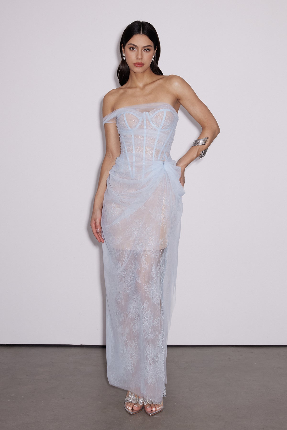 The Dechen One Shoulder Corset Mesh Maxi Dress in Blue combines sophisticated design with contemporary style. Featuring a structured corset bodice, it offers a flattering silhouette that accentuates the waist. The one-shoulder neckline adds an asymmetrical elegance, while the lightweight mesh fabric ensures breathability and a delicate, ethereal look. This maxi dress is perfect for formal occasions or upscale events, providing both comfort and striking visual appeal. Its refined cut highlights expert tailoring ideal for those seeking a balance of modern fashion and classic grace.