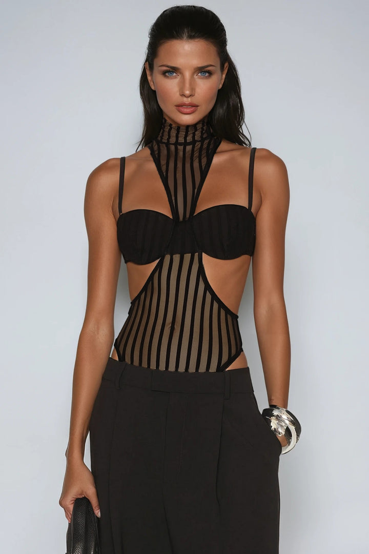 Devan Mesh Cutout Bodysuit Engineered for modern sophistication, this bodysuit combines sheer mesh paneling with strategic cutout detailing for a bold, contemporary silhouette. The seamless construction ensures a smooth fit under any garment, while the breathable mesh fabric provides comfort throughout the day. Versatile enough to layer or wear as a statement piece, this design bridges the gap between everyday wear and evening elegance. Perfect for those seeking refined edge in their wardrobe.