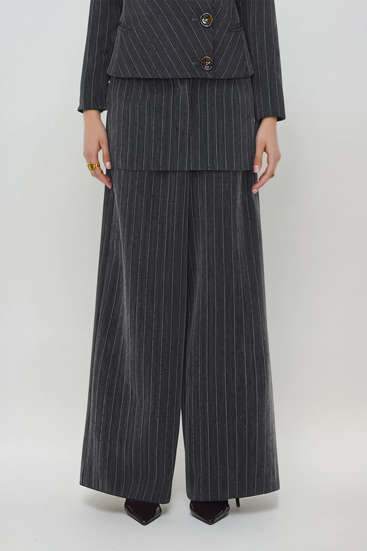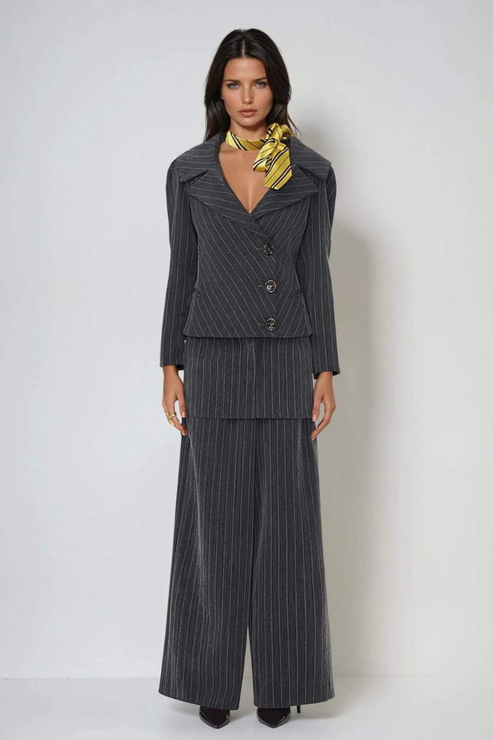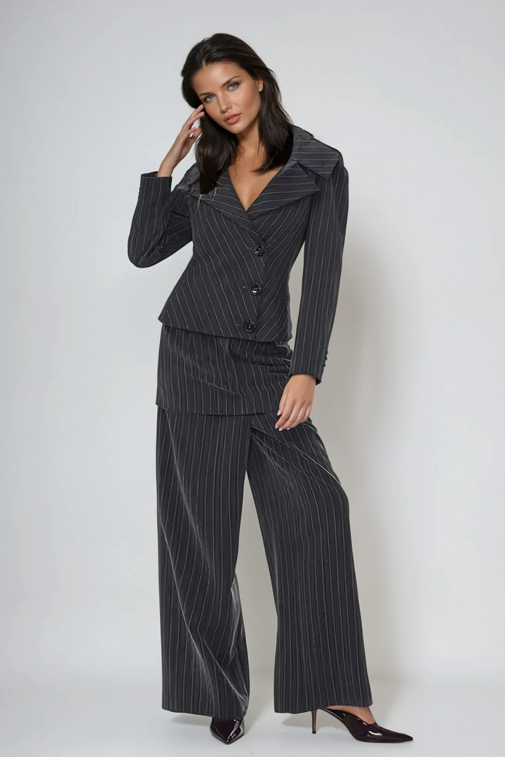 Dinko Plunge Asymmetric Stripe Pants Set This contemporary two-piece ensemble features a striking asymmetric stripe pattern that commands attention. The plunge neckline on the top creates a sophisticated silhouette, while the coordinating pants offer a modern cut that balances the bold design. Crafted for those who appreciate architectural tailoring and statement-making style, this set delivers polished versatility—equally at home for elevated casual wear or refined evening occasions. The asymmetric detailing adds visual interest without sacrificing wearability, making it a distinctive addition to any wardrobe.