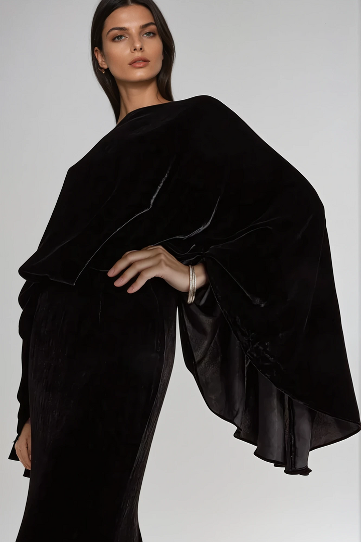 Elevate your evening wardrobe with the Dixon Cape Sleeve Velvet Maxi Dress. Crafted from luxurious velvet in classic black, this floor-length silhouette features dramatic cape sleeves that create an effortlessly sophisticated silhouette. Strategic ruching through the bodice provides flattering definition while adding textural interest. The flowing maxi length and refined draping make this piece ideal for formal events, galas, and upscale occasions. A timeless investment piece that transitions seamlessly from season to season.