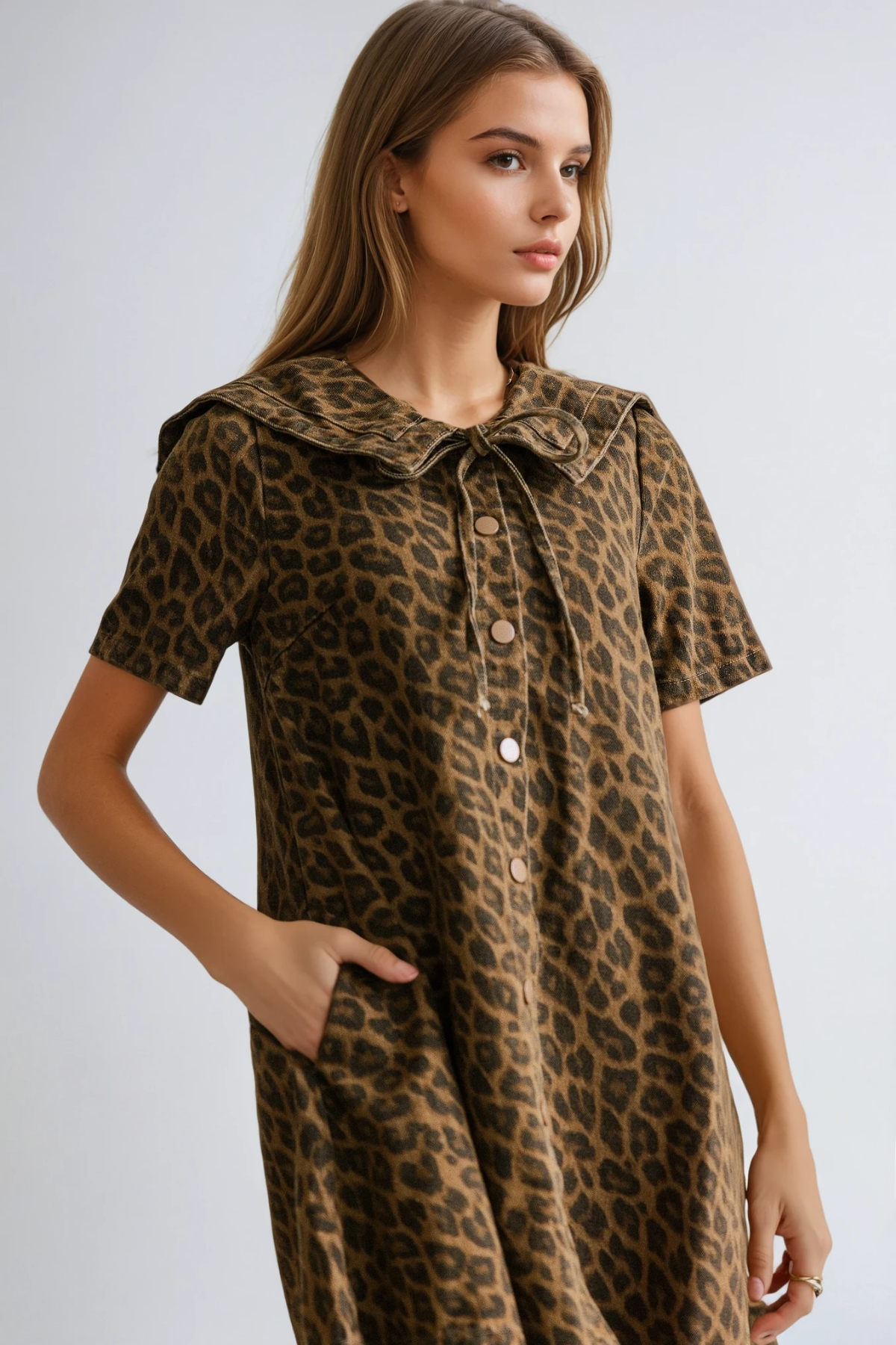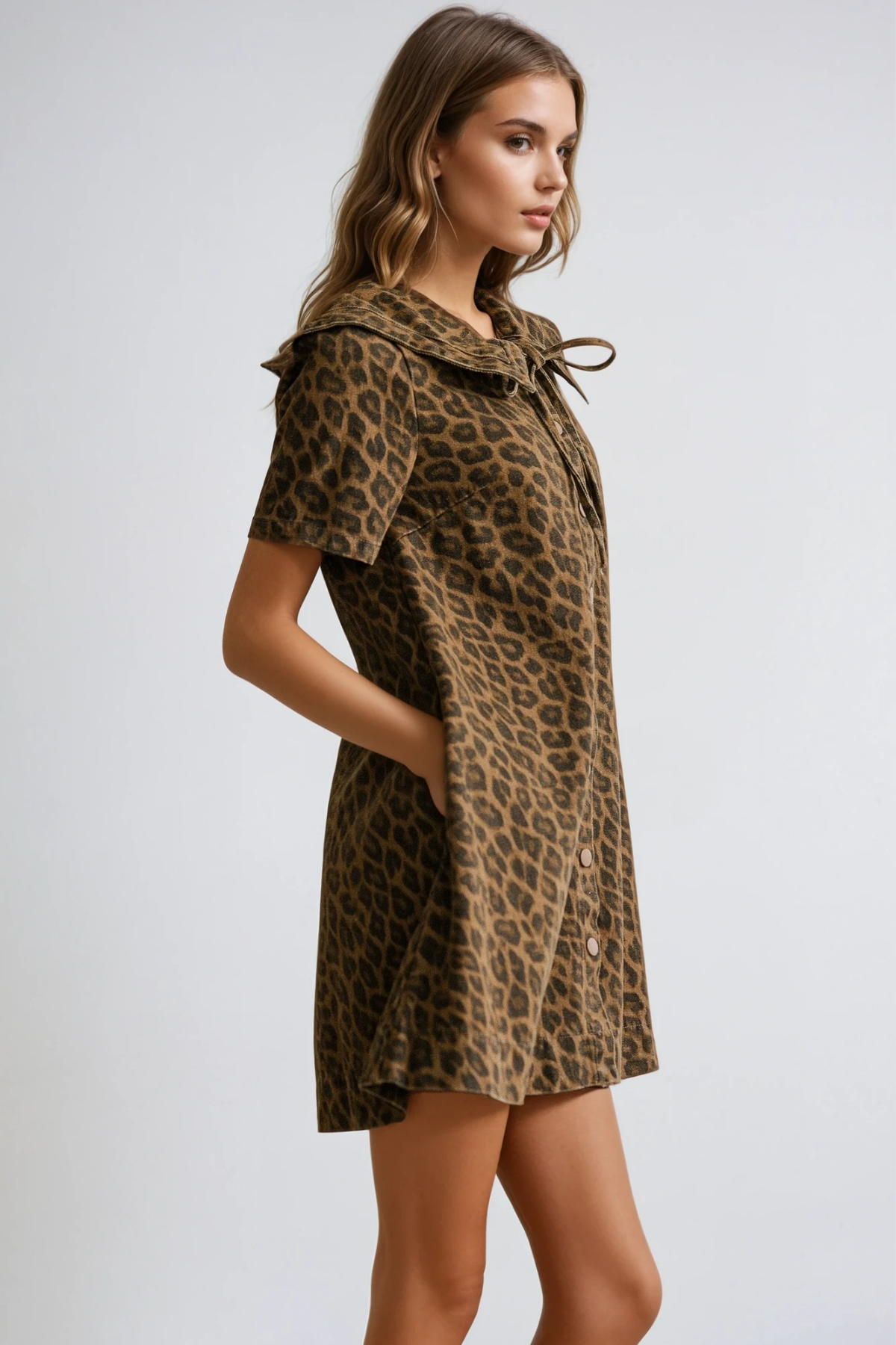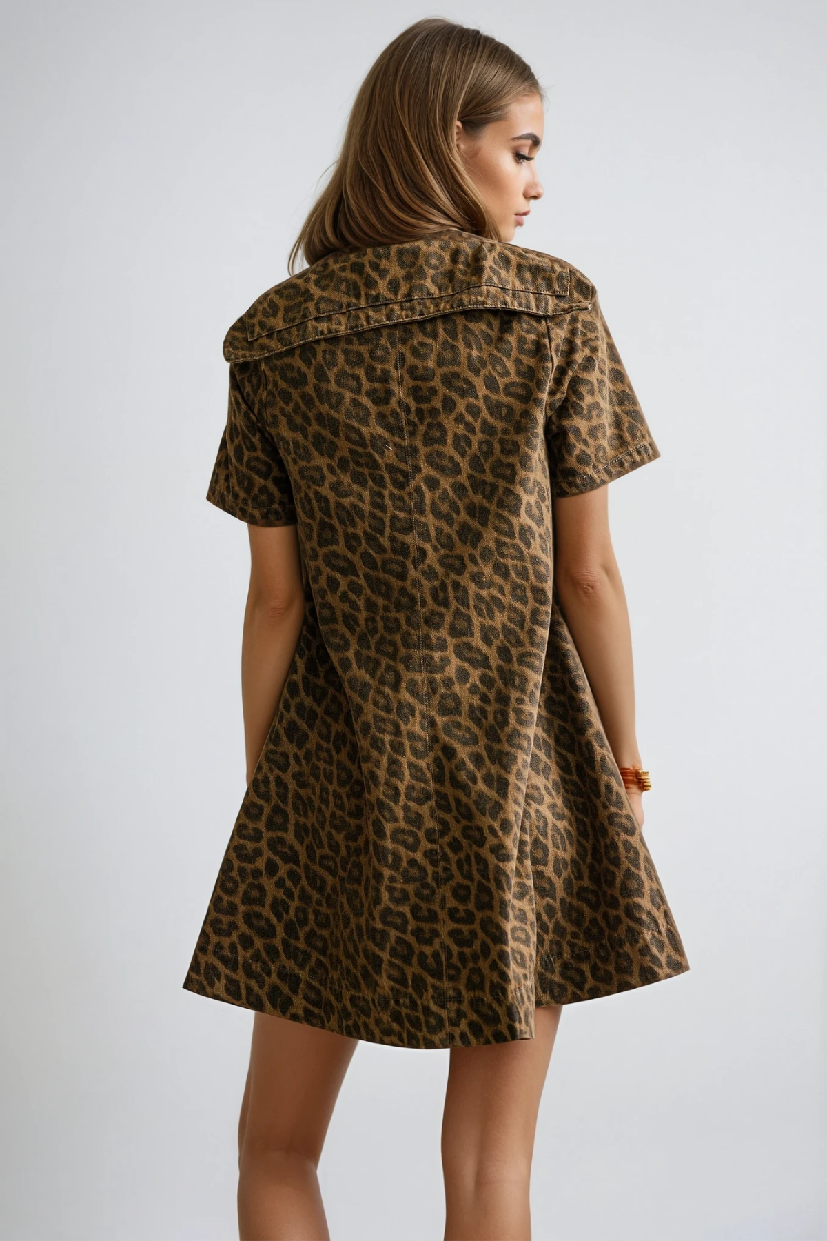 The Dragutin Lapel Denim Leopard Mini Dress in Brown merges classic denim construction with contemporary animal print styling. Featuring a structured lapel collar that frames the neckline with sophistication, this mini dress combines rich brown denim with a striking leopard pattern for versatile visual interest. The tailored silhouette offers a polished foundation suitable for both casual and elevated occasions, while the mini length provides modern proportion. Quality denim fabric ensures durability and comfortable wear throughout the day. An ideal piece for those seeking distinctive style without compromising on timeless denim appeal.