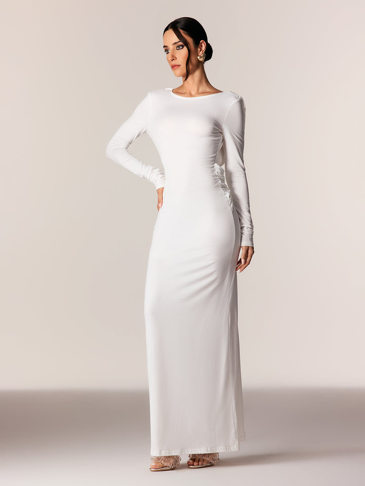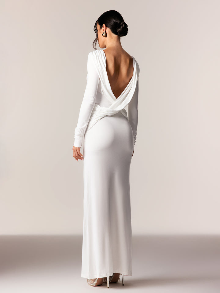Ealasaid Backless Long Sleeve Maxi Dress This striking maxi dress combines contemporary elegance with bold design elements. The long sleeves provide refined coverage while the dramatic backless silhouette creates an unforgettable statement. The floor-length cut offers sophisticated proportions, making it ideal for evening events, formal occasions, or upscale social gatherings. The contrast between modest sleeves and the daring open back delivers a modern take on classic evening wear. Crafted for those who appreciate architectural design and aren't afraid to make a memorable impression.