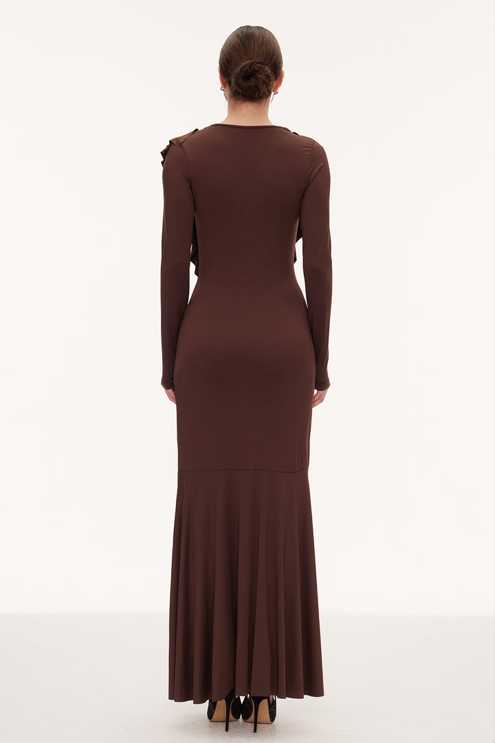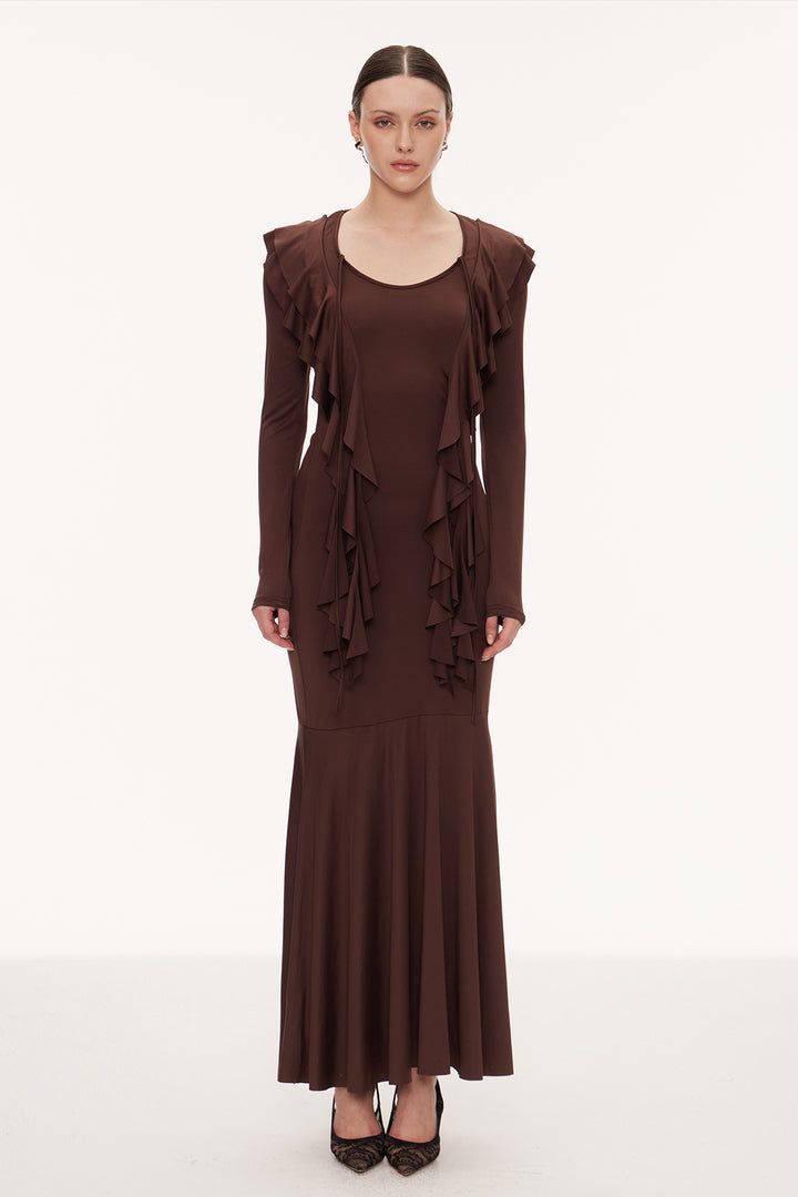 The Eirene Ruffle Maxi Dress combines timeless elegance with contemporary design. Featuring cascading ruffles that create movement and dimension, this floor-length silhouette flatters various body types while delivering sophisticated style. The maxi length offers versatility—dress it up for evening events or down for refined casual wear. Crafted with attention to detail, the ruffle accents add visual interest without overwhelming the silhouette. Perfect for those seeking a statement piece that balances drama with wearability.
