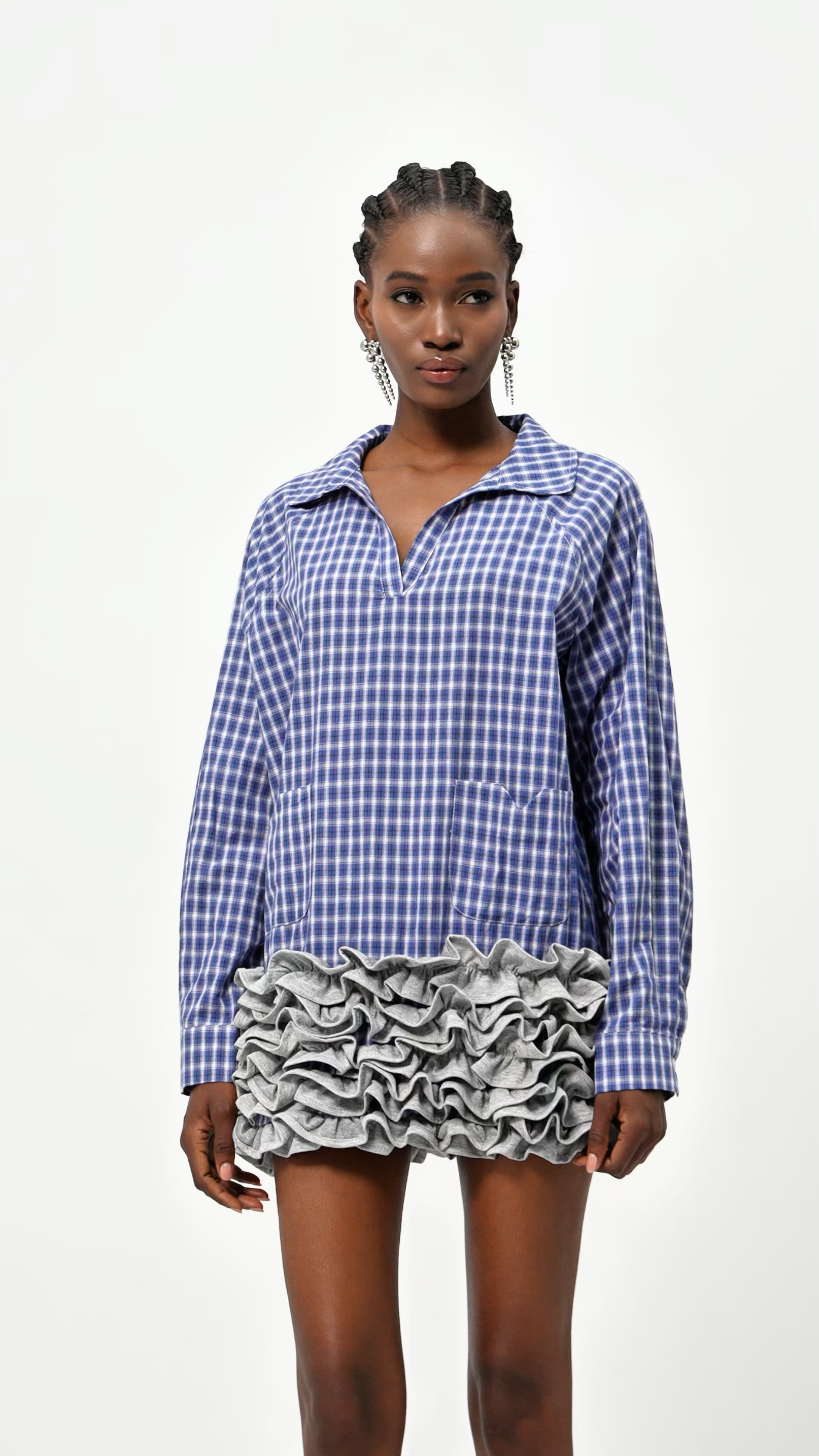 The Errol Grid Ruffle Mini Shirt Dress blends modern grid patterns with feminine ruffle accents. Its tailored silhouette and mini length offer versatile elegance, making it perfect for both casual outings and refined occasions.