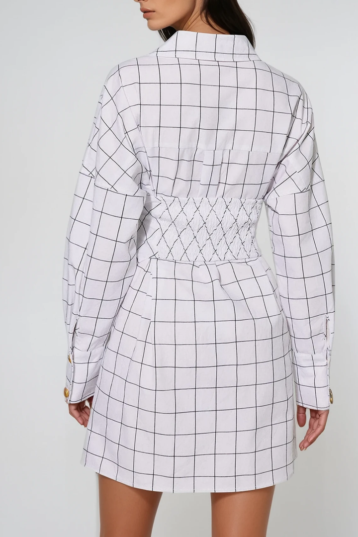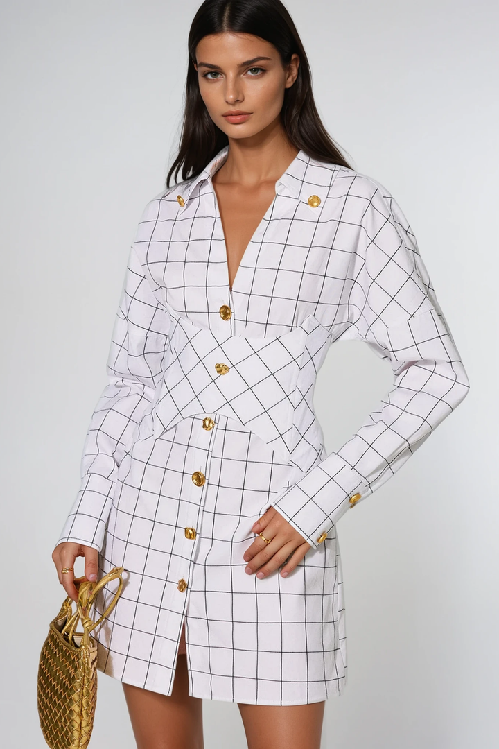 The Lizbeth Grid Mini Shirt Dress combines structured tailoring with contemporary minimalism. Crafted from a crisp grid-patterned fabric, this piece transitions seamlessly from office to evening wear. The shirt dress silhouette features a defined waistline and collar detailing that flatters multiple body types, while the mini length offers modern versatility. Layer it over basics for cooler months or wear solo during warmer seasons. An essential wardrobe staple that delivers both polish and practicality.