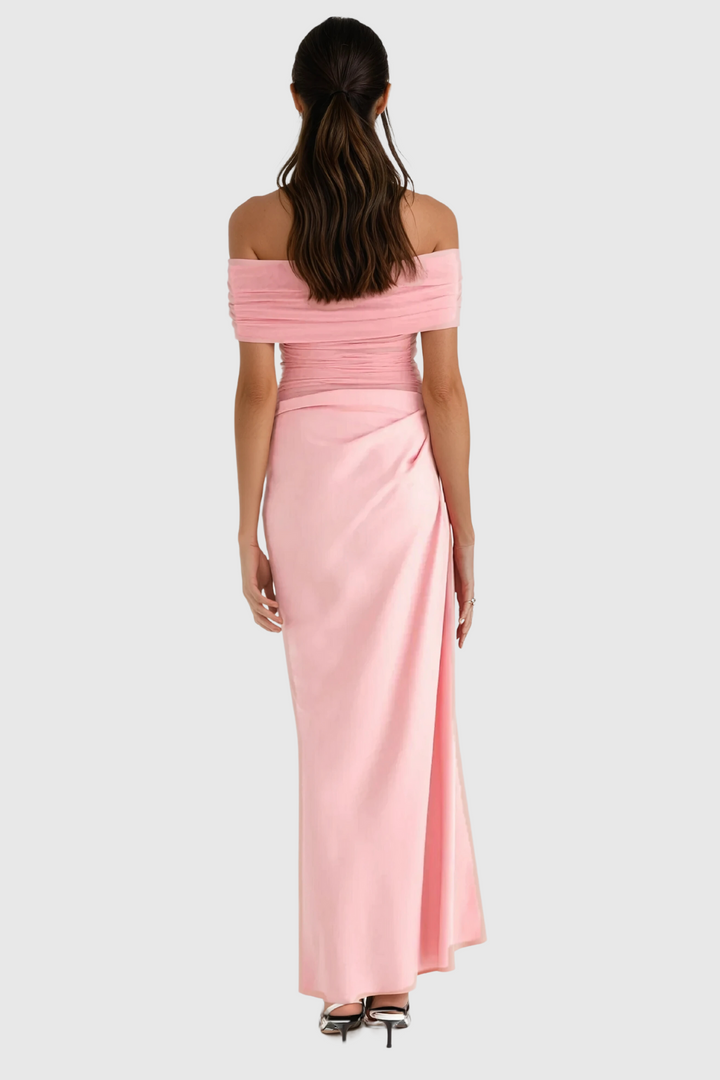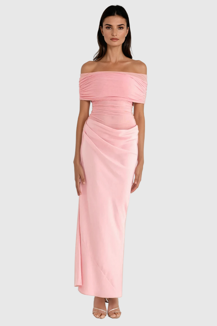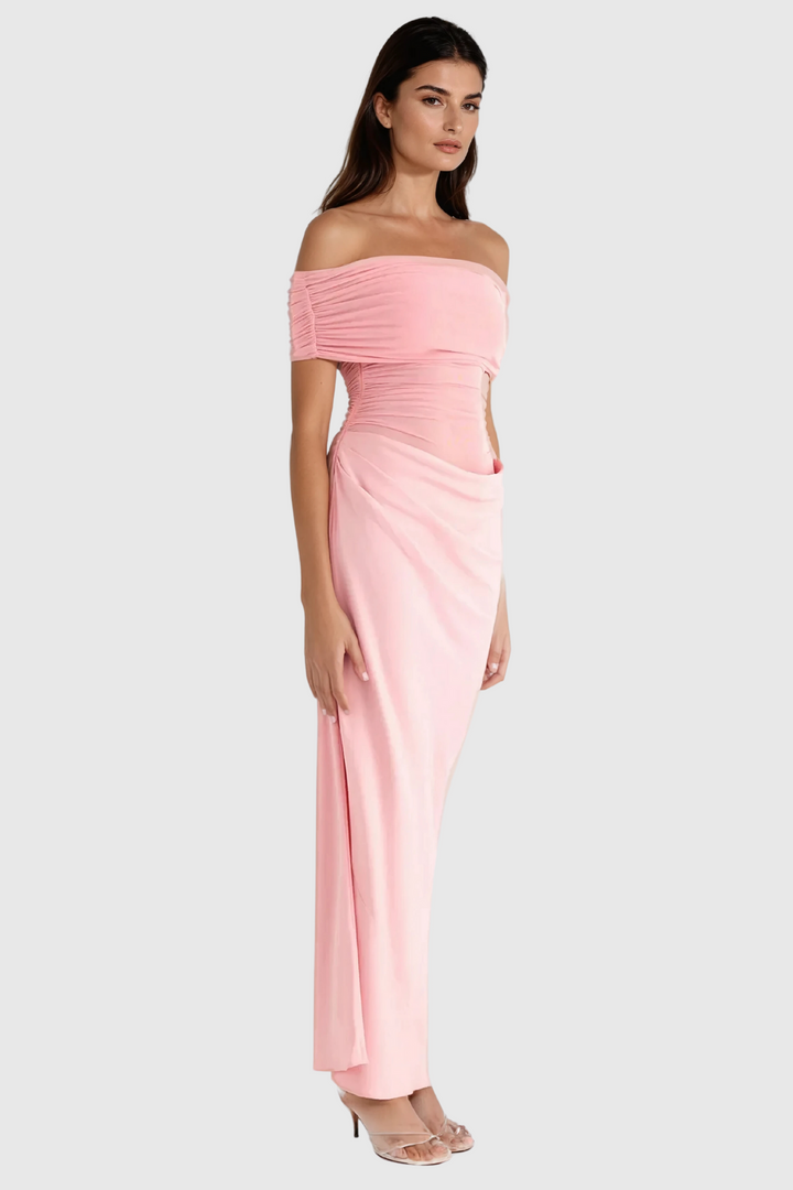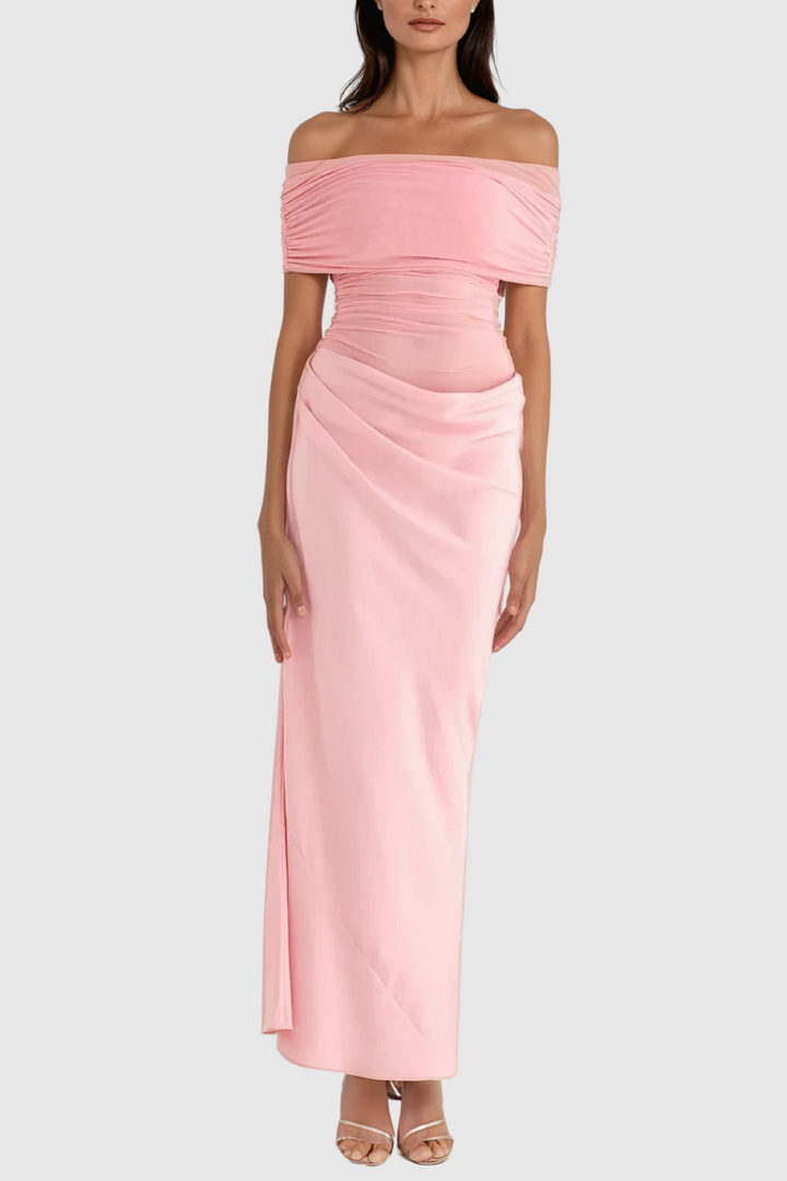 Alucia Off Shoulder Ruch Mesh Maxi Dress In Pink