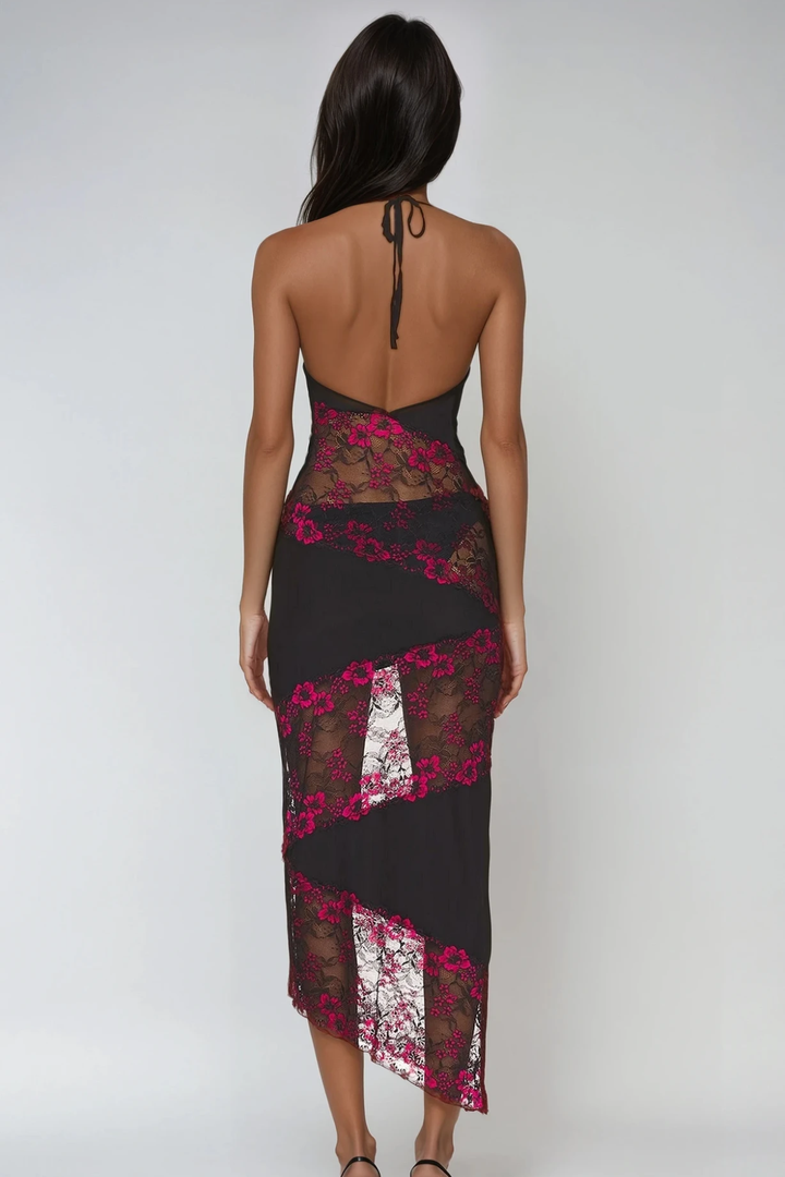 Diederik's deconstructed approach to classic femininity reimagines the floral lace maxi through strategic layering and asymmetrical cuts. Sheer lace panels reveal unexpected silhouettes beneath, while the floor-length hem maintains an elegant drape. This piece balances avant-garde design with wearable sophistication, offering a statement option for those seeking refined individuality in their wardrobe.