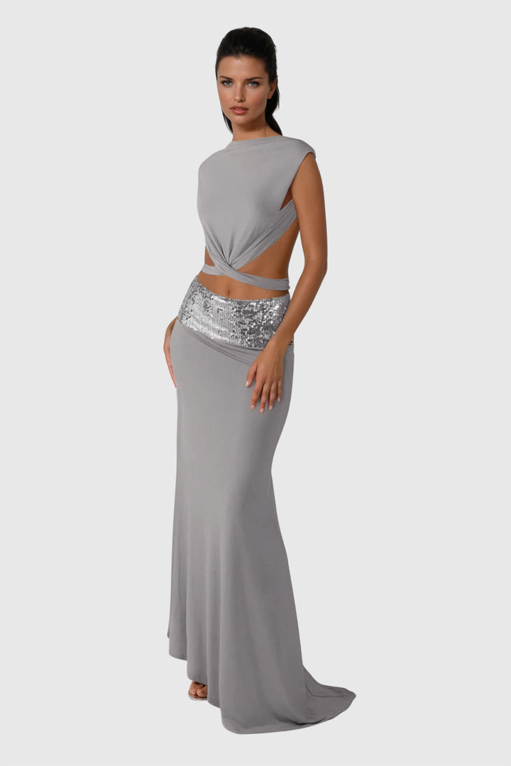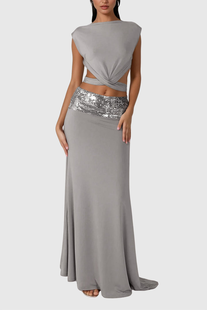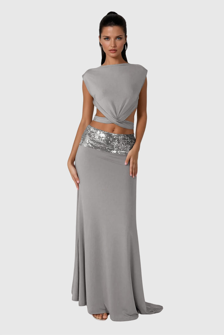 Elevate your evening wardrobe with the Chrysanta Sequin Cutout Skirt Set. Expertly crafted to combine shimmering sequins with strategic cutouts, this set offers a refined balance of allure and sophistication. Its tailored silhouette enhances your figure, while the high-quality sequined fabric ensures lasting shine and structure. Ideal for standout events, it delivers a polished, fashion-forward statement with every wear.