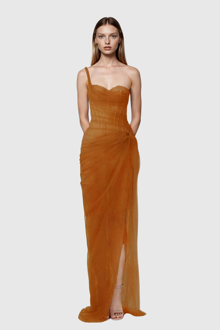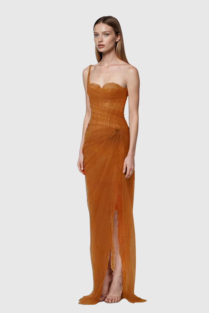 Dechen One Shoulder Corset Mesh Maxi Dress In Brown