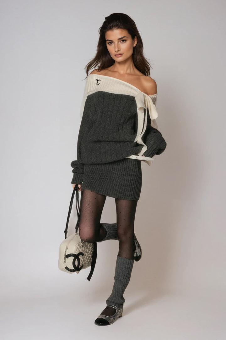 Elevate your wardrobe with this sophisticated off-shoulder knit mini dress, expertly crafted in a refined grey tone. The signature bow detail at the neckline adds an elegant focal point, while the fitted knit construction provides both comfort and a flattering silhouette. Perfect for transitional dressing, this piece seamlessly moves from casual daytime wear to evening occasions. The mini length offers a modern, youthful edge, making it an essential addition for those who appreciate timeless design with contemporary flair.