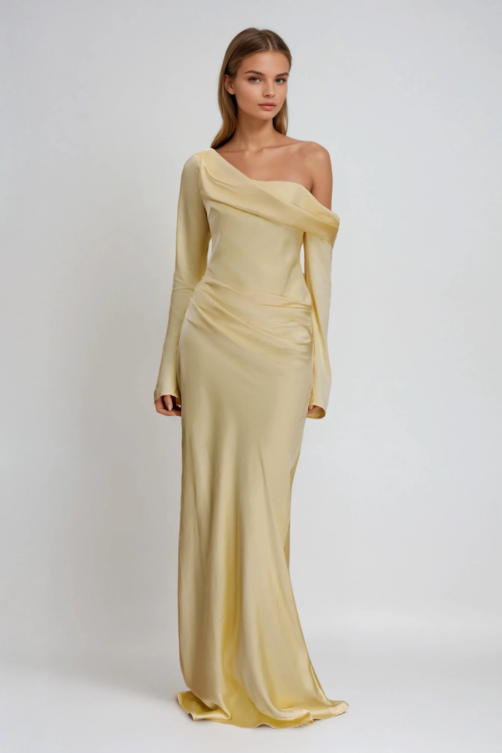 Elevate your evening wardrobe with the Divina One Shoulder Satin Maxi Dress in Butter Yellow. This sophisticated silhouette features an elegant asymmetrical neckline that creates a striking focal point, while luxurious satin fabric drapes beautifully to the floor. The single shoulder design offers a modern twist on classic elegance, flattering various body types with its fluid construction. Perfect for formal events, galas, or upscale celebrations, this dress combines refined craftsmanship with contemporary styling. The warm butter yellow tone complements a range of skin tones and pairs effortlessly with statement jewelry and metallic accessories for a polished, show-stopping look.
