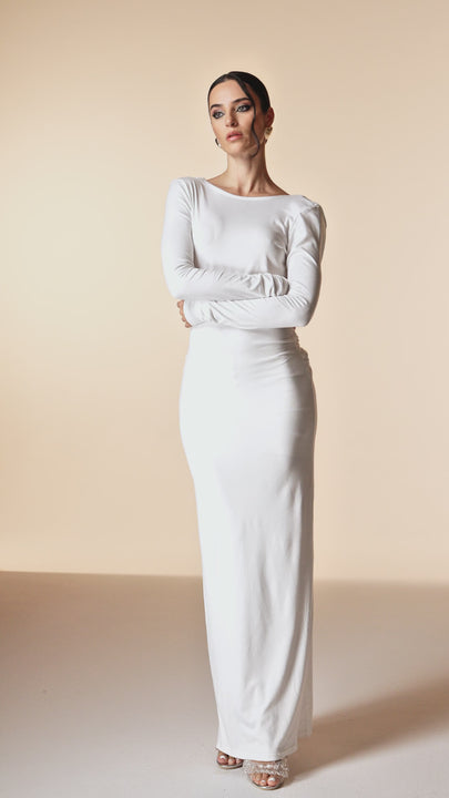 Ealasaid Backless Long Sleeve Maxi Dress This striking maxi dress combines contemporary elegance with bold design elements. The long sleeves provide refined coverage while the dramatic backless silhouette creates an unforgettable statement. The floor-length cut offers sophisticated proportions, making it ideal for evening events, formal occasions, or upscale social gatherings. The contrast between modest sleeves and the daring open back delivers a modern take on classic evening wear. Crafted for those who appreciate architectural design and aren't afraid to make a memorable impression.