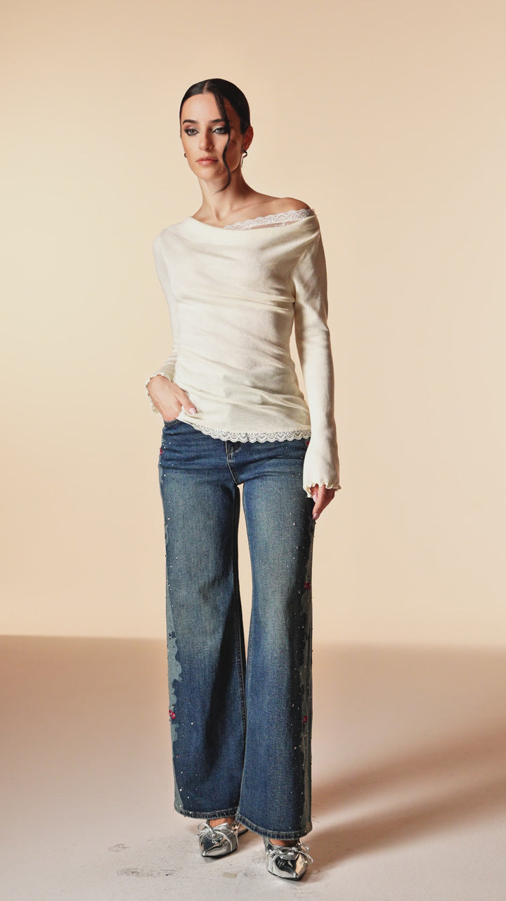 The Edeltraud Asymmetric Lace Knit Top showcases sophisticated design through its distinctive off-center construction and delicate lace detailing. Crafted from premium knit fabric, this piece delivers refined elegance with modern sensibility. The asymmetrical silhouette creates visual interest and flatters various body types, while the lace elements add texture and dimension. Versatile enough for both professional settings and elevated casual wear, this top pairs seamlessly with tailored trousers, denim, or skirts. An investment piece that transcends seasonal trends.