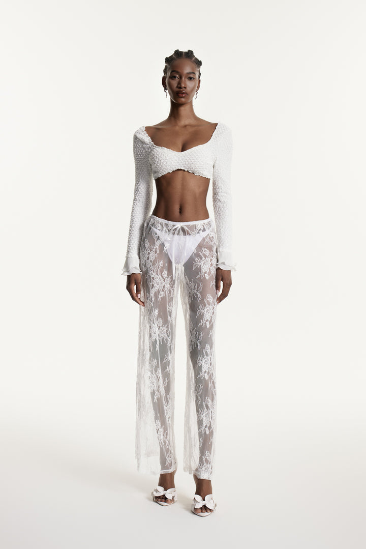 Edmonde Lace Pants combine delicate craftsmanship with contemporary silhouette. Intricate lace detailing creates visual interest while maintaining sophistication, making these pants versatile for both elevated casual and refined evening occasions. The thoughtful construction ensures comfort without compromising on style. Perfect for those who appreciate nuanced design and quality fabrication in their wardrobe essentials.